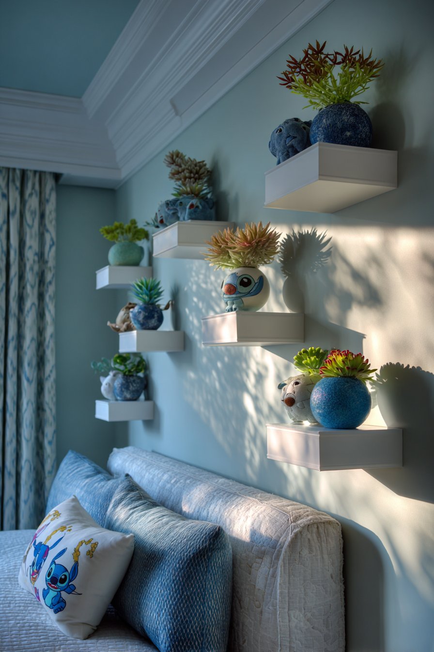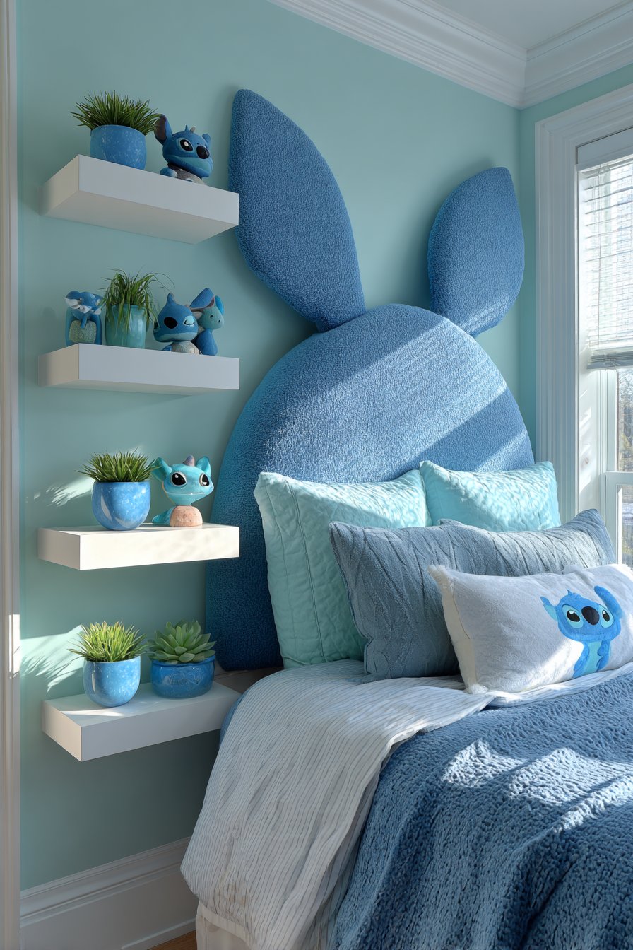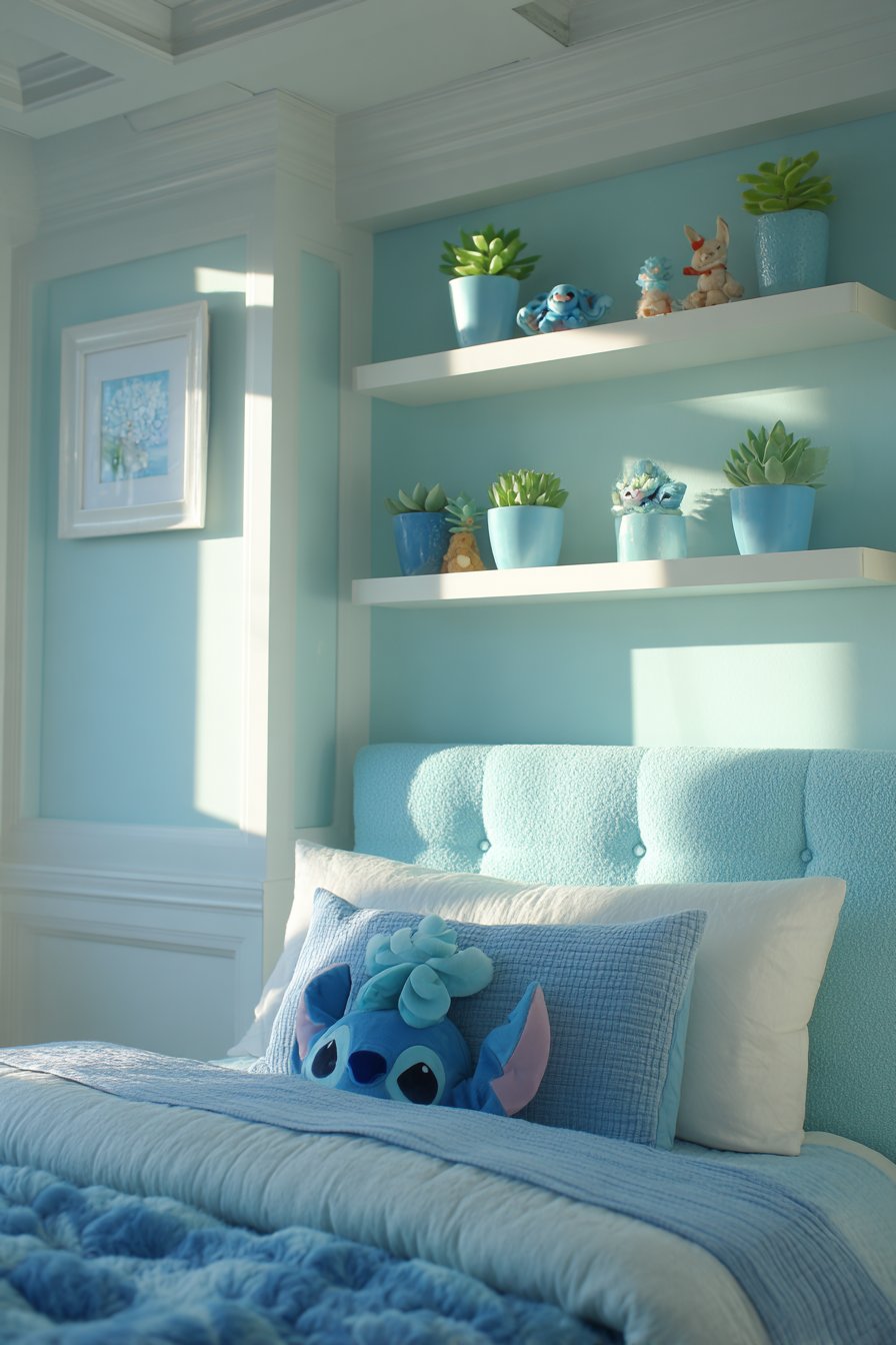 Layered bedding showcases various blue shades. White accents provide visual breaks between tones. A Stitch character pillow crowns the arrangement. Flanking floating shelves display collectibles and small plants. Blue ceramic pots hold easy-care succulents safely.