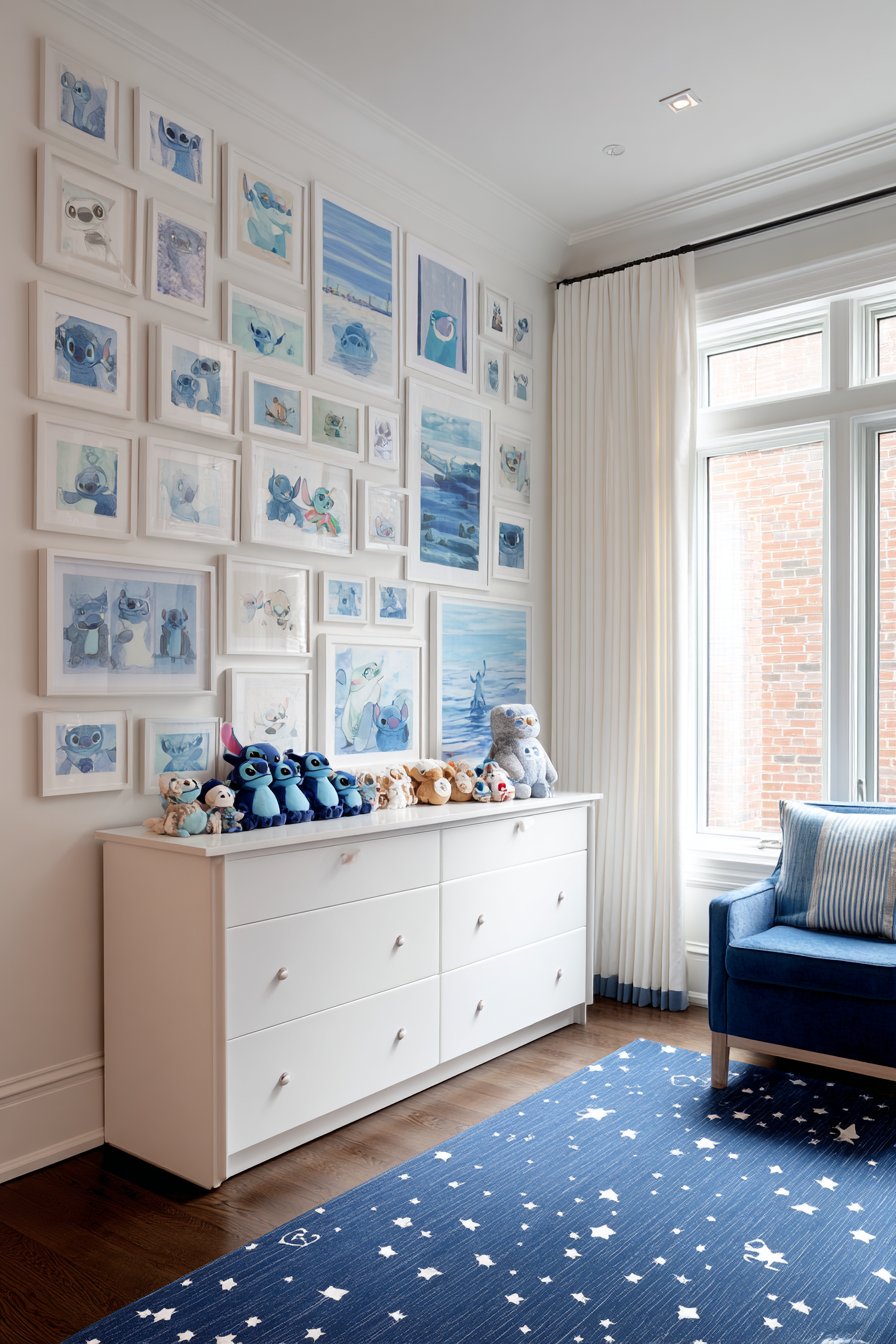 Multiple framed prints showcase different Stitch expressions. Various poses capture the character’s playful personality. Coordinating blue frames vary in size strategically. The gallery wall creates dynamic visual interest. Professional arrangement principles guide the layout.