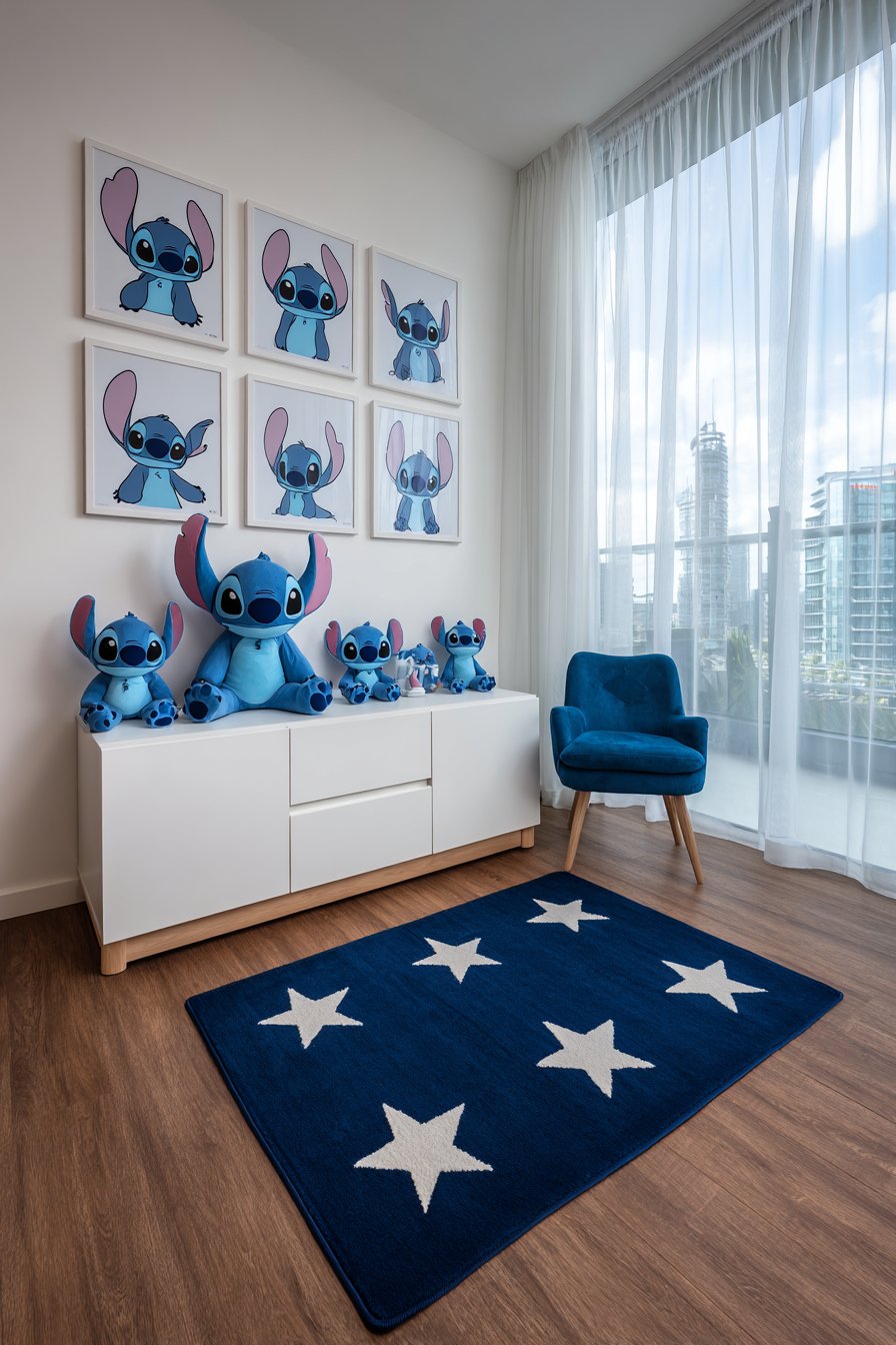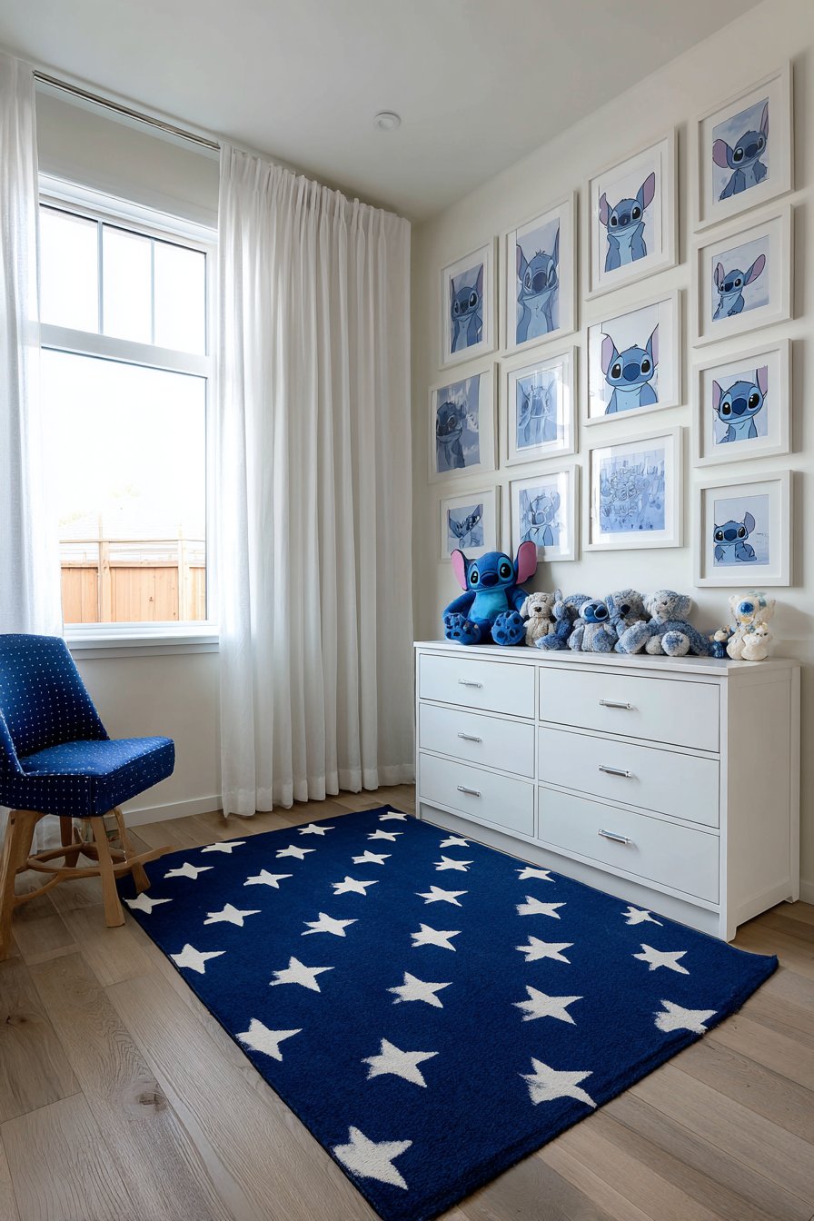 Below sits a white low-profile dresser. A Stitch plush collection is arranged by size across the top. The organized display prevents cluttered appearance. Navy blue rectangular rug features white stars. The pattern adds movement without competing with walls.