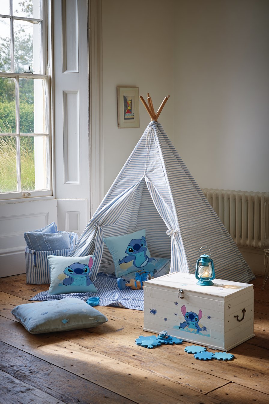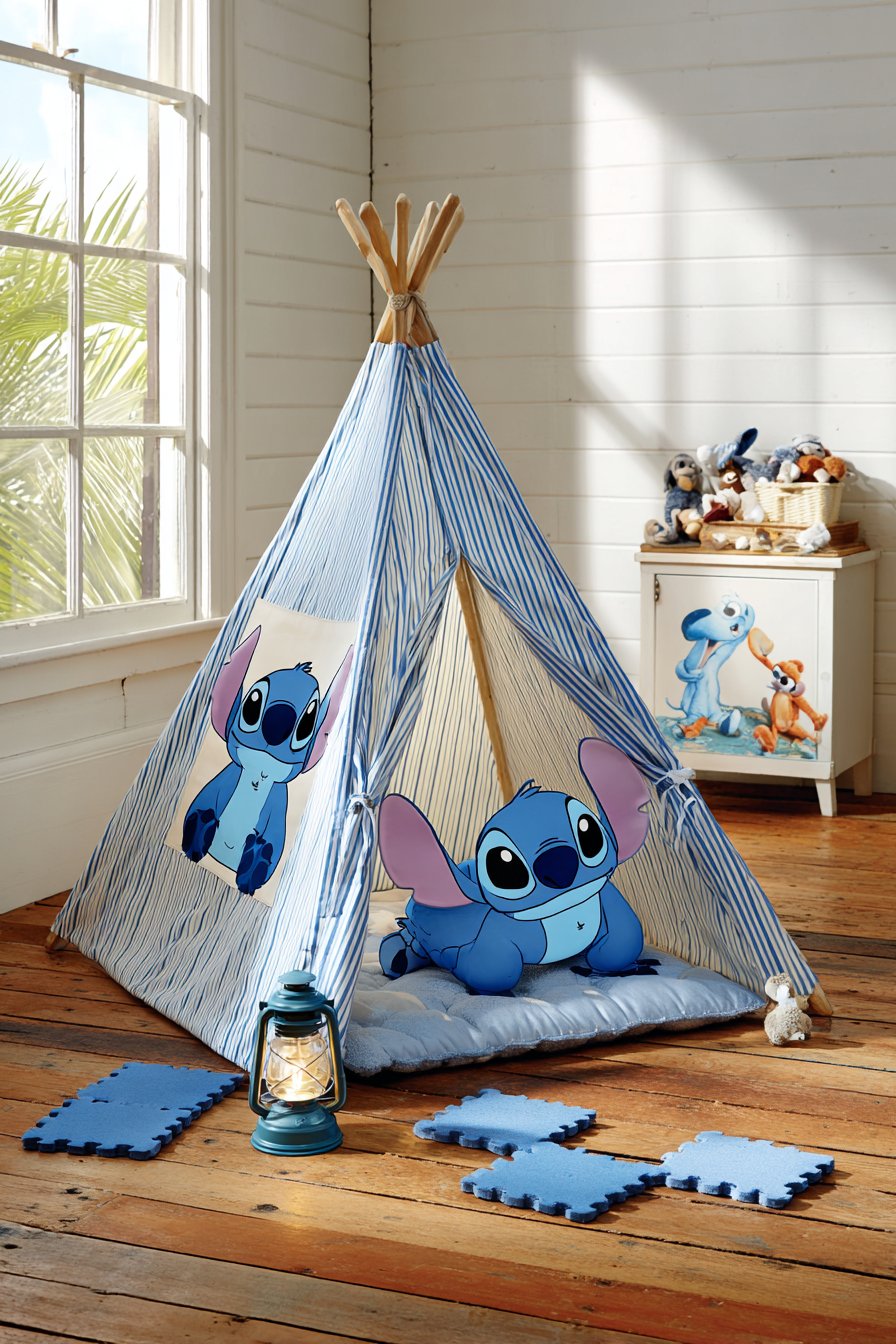 A white toy chest features hand-painted Stitch scene. The custom artwork adds unique personality. Additional toy stores are conveniently inside. Wooden flooring surrounds the tent area. Scattered blue foam tiles cushion the play zone.