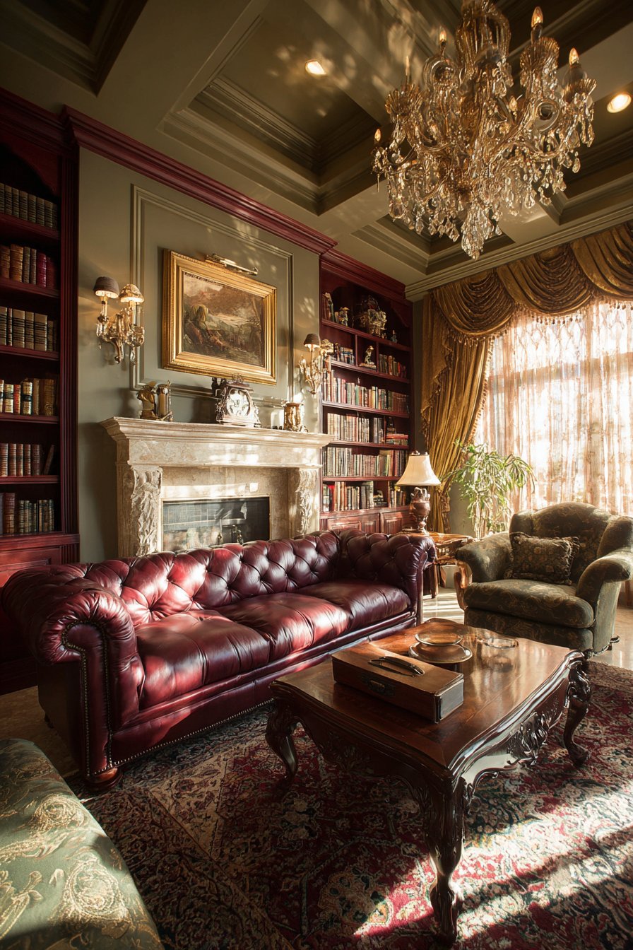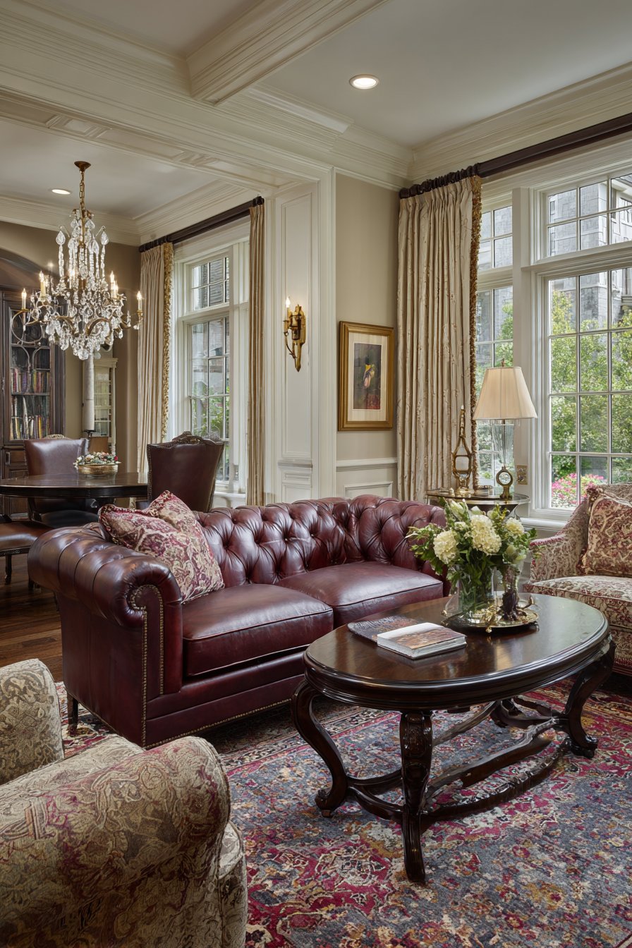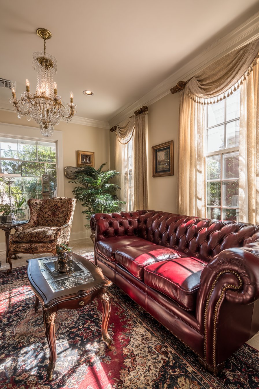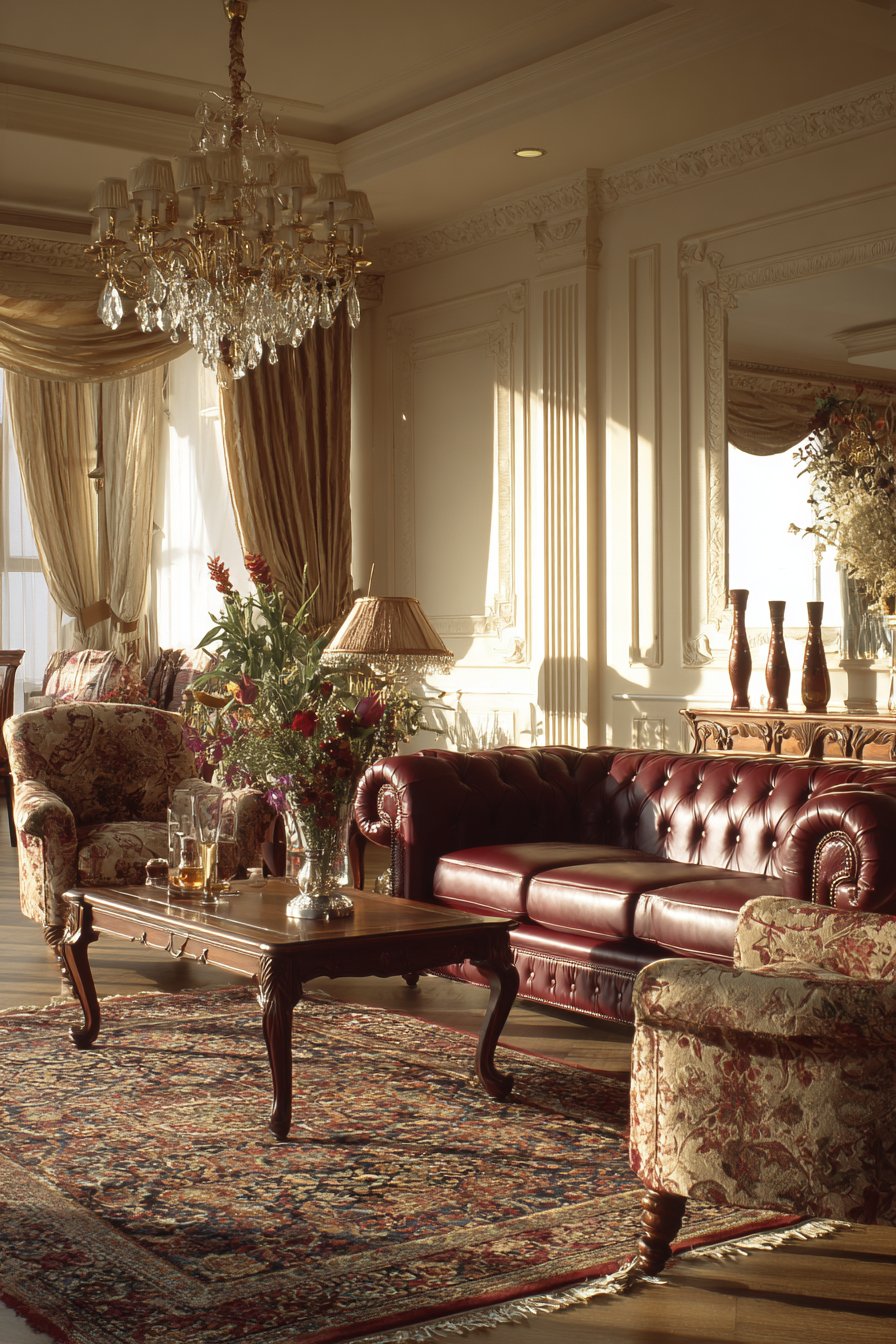 Picture a living room where a magnificent Chesterfield sofa commands attention. The rich burgundy leather features deep button tufting throughout. Classic rolled arms showcase traditional craftsmanship at its finest. Above, a crystal chandelier with brass accents illuminates the space beautifully.