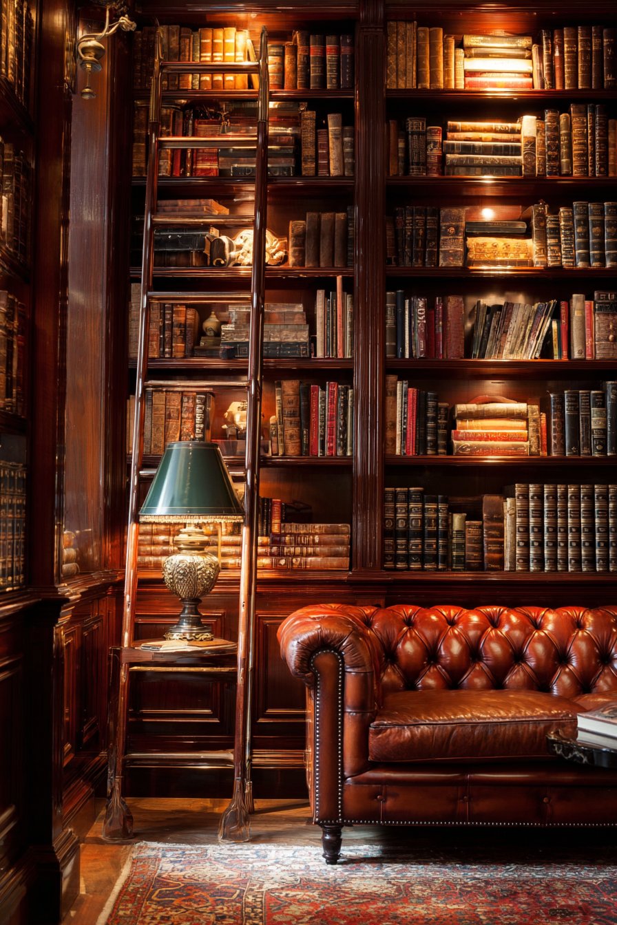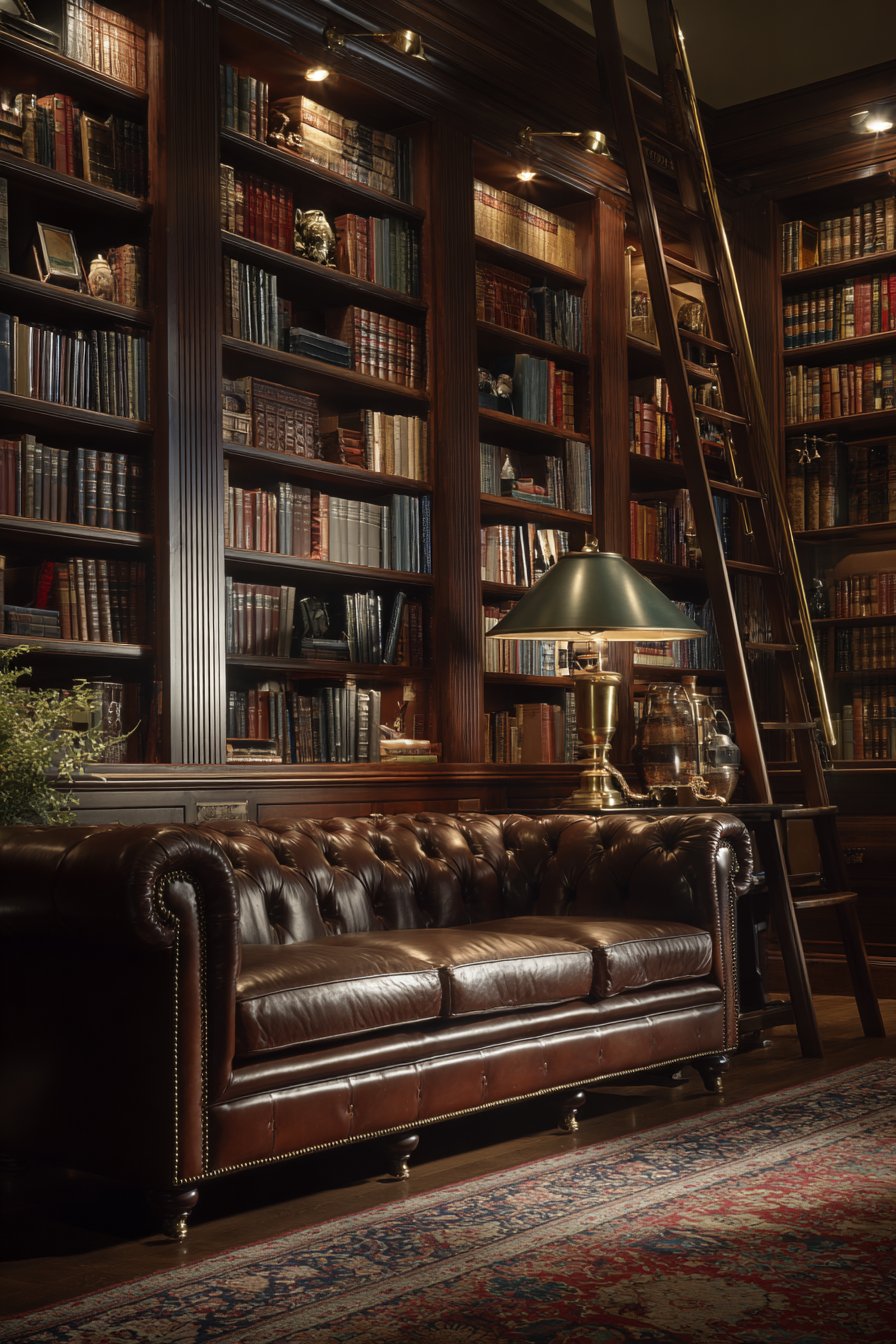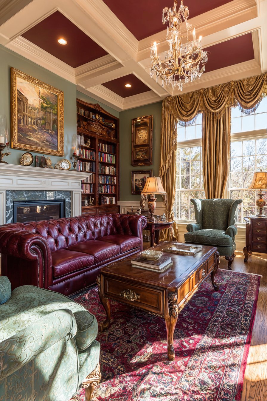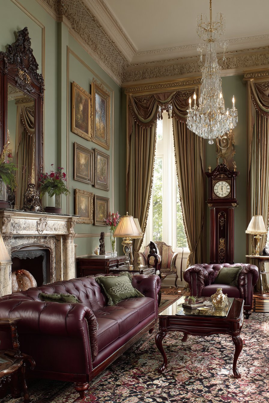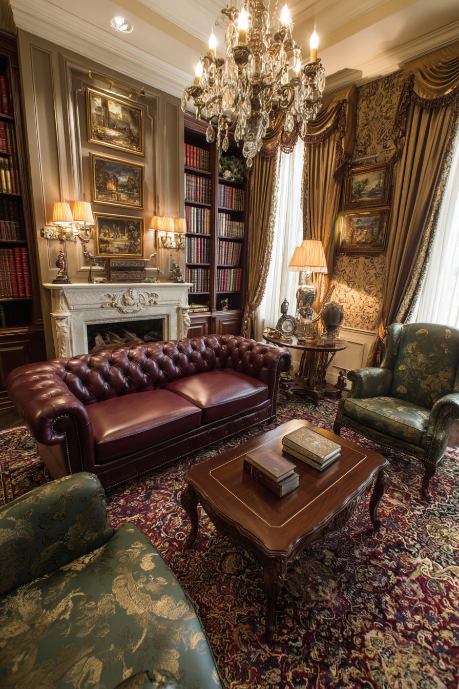 Picture a living room where a magnificent Chesterfield sofa commands attention. The rich burgundy leather features deep button tufting throughout. Classic rolled arms showcase traditional craftsmanship at its finest. Above, a crystal chandelier with brass accents illuminates the space beautifully.