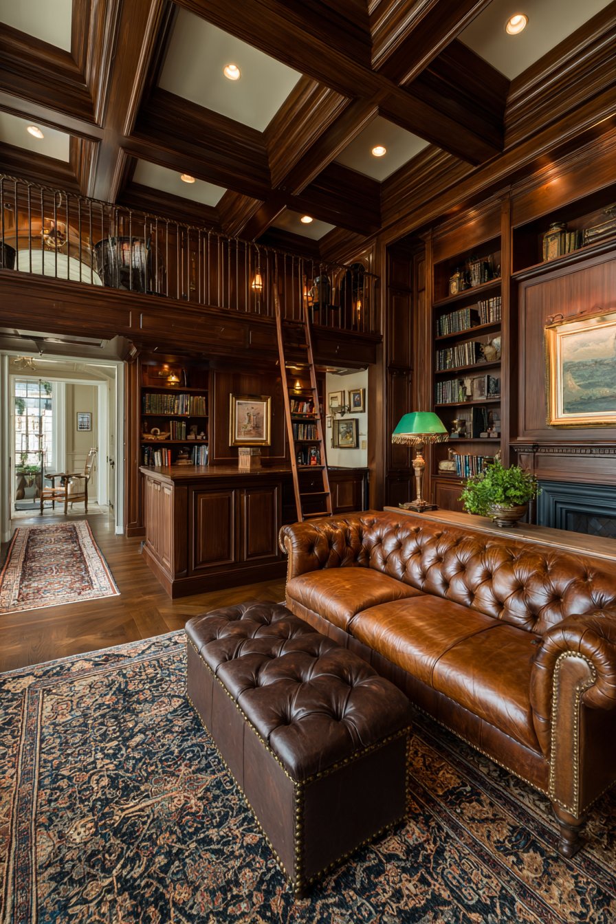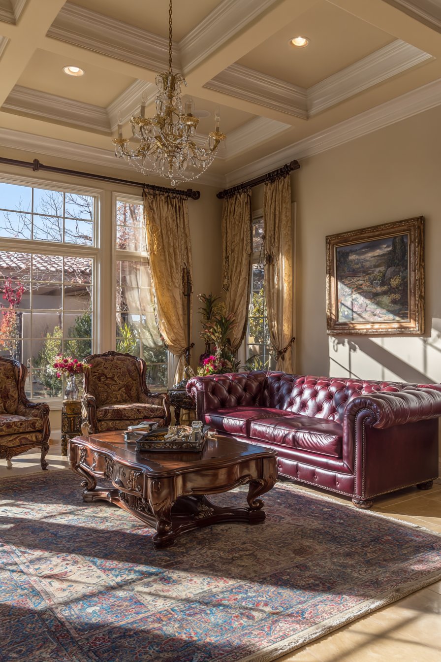 The interplay of textures creates remarkable visual richness. Smooth leather contrasts beautifully with soft damask upholstery. Carved wood surfaces complement the plush wool rug beneath. Crystal catches and reflects light throughout the room. Every material contributes to the sophisticated traditional atmosphere.
