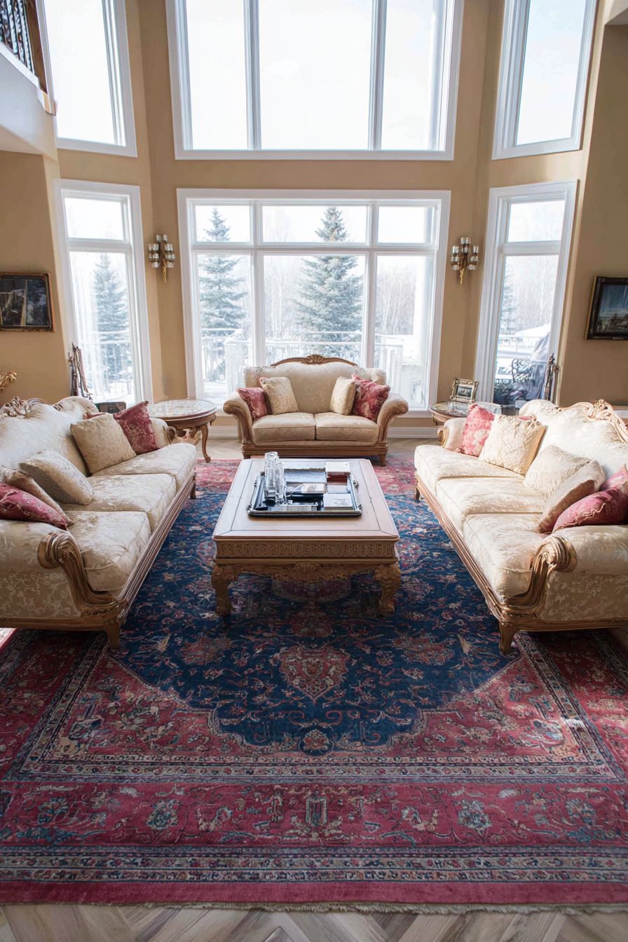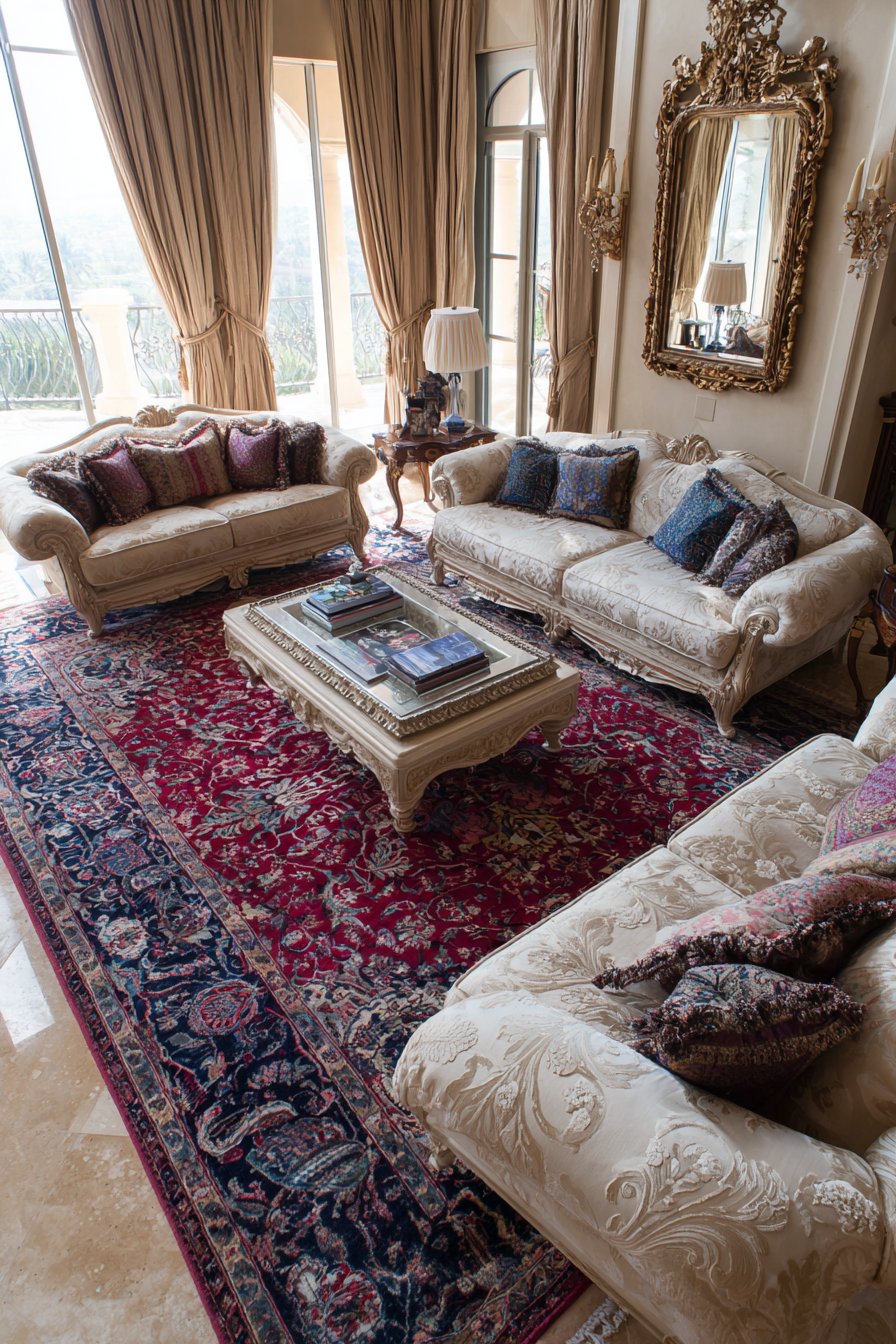 - Select a large-scale Persian or Oriental rug to anchor seating arrangements