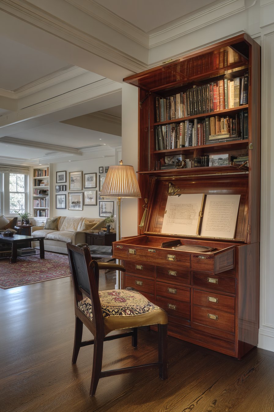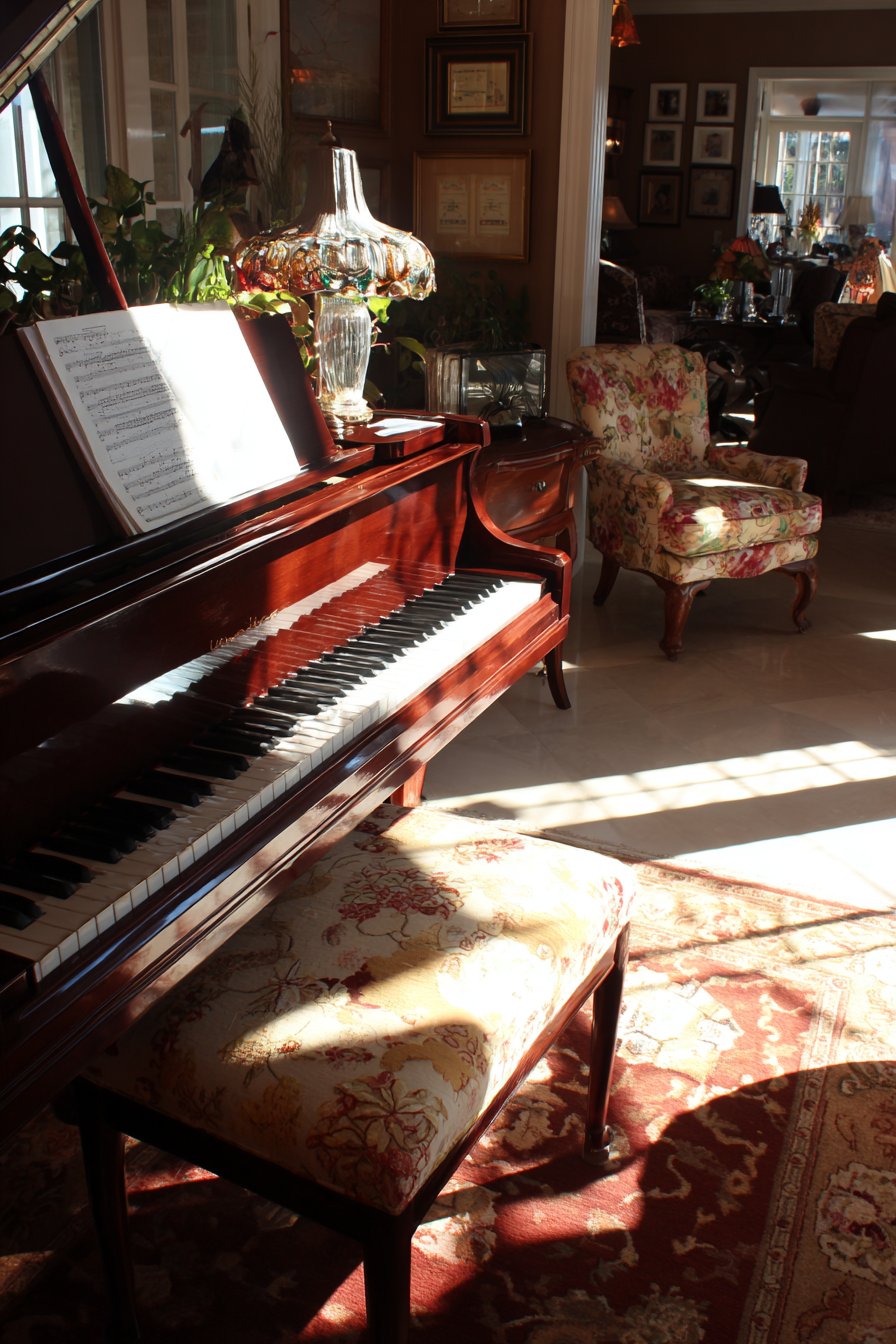 Natural window light highlights the piano’s glossy finish throughout the day. The polished mahogany develops richer character over time. Vintage sheet music adds personal history to the space. The needlepoint bench cushion introduces handcrafted texture. Everything celebrates the musical function of this area.