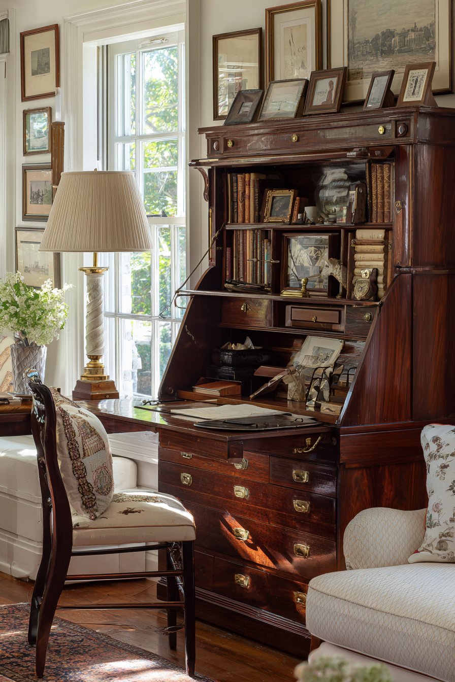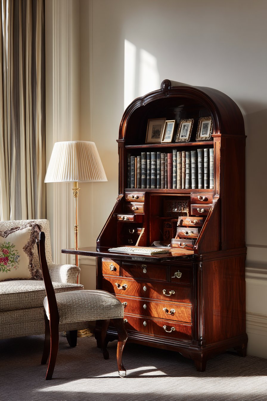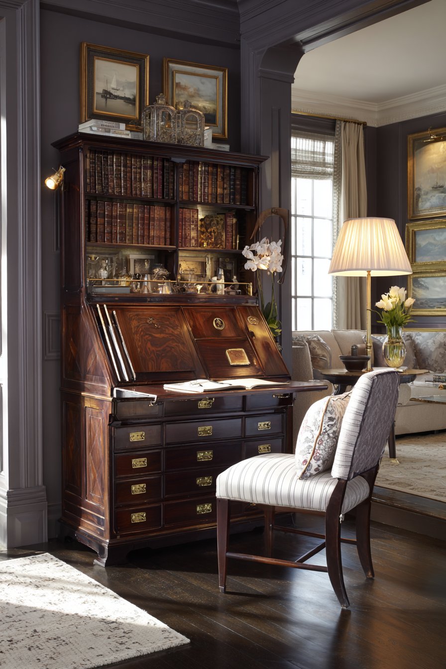 This vignette demonstrates traditional design’s appreciation for heritage pieces. Antique furniture adds an authentic character impossible to replicate. Quality leather ages beautifully with proper care. Traditional patterns in the rug provide visual grounding. Everything celebrates craftsmanship and timeless design.