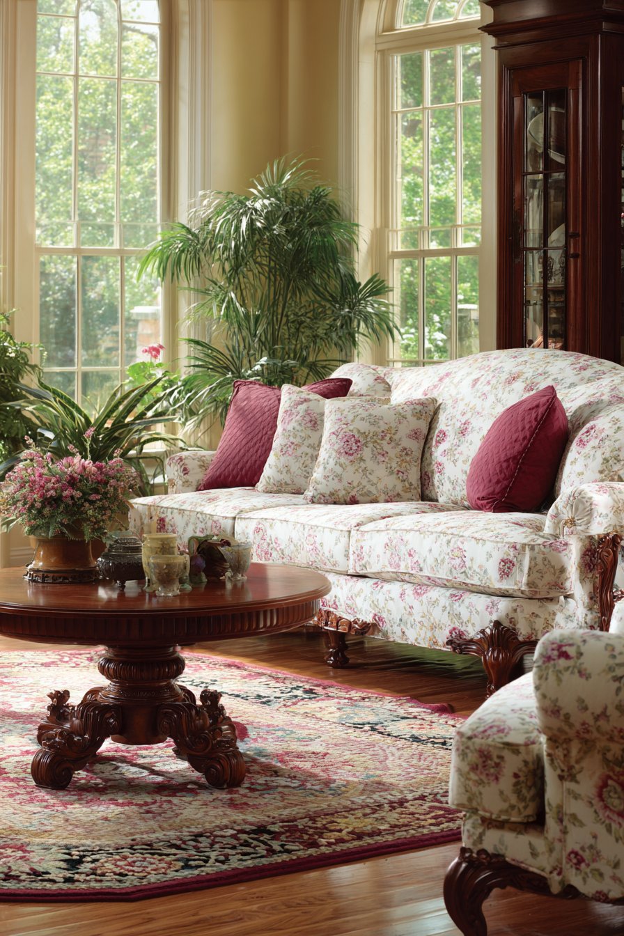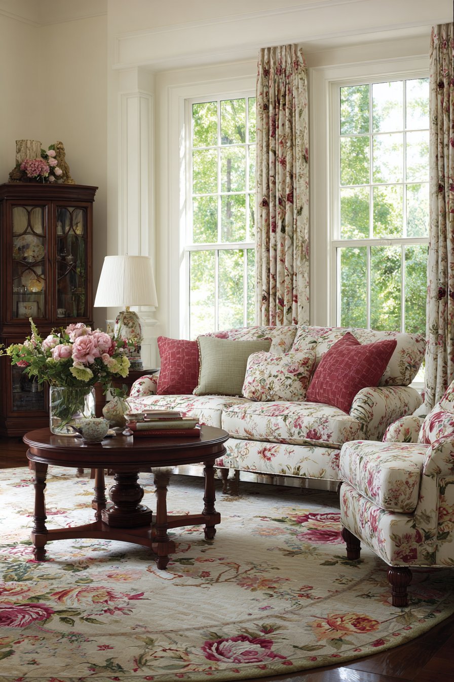 The furniture creates comfortable traditional elegance perfect for families. A round pedestal coffee table sits on a floral needlepoint rug. The layered patterns create cottage-style traditional charm. Soft diffused natural light enhances the harmonious color palette. Everything invites relaxation and comfortable gathering.