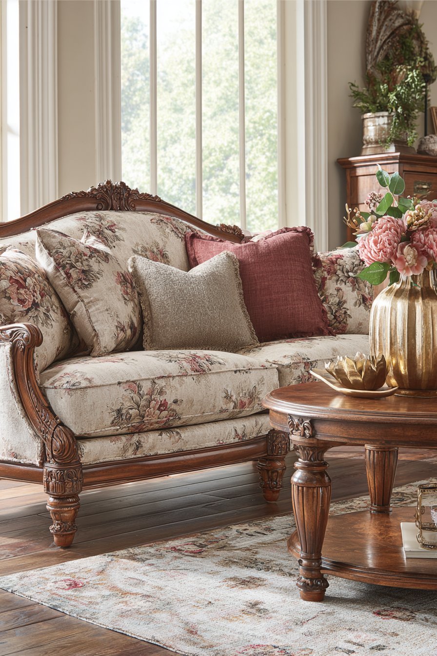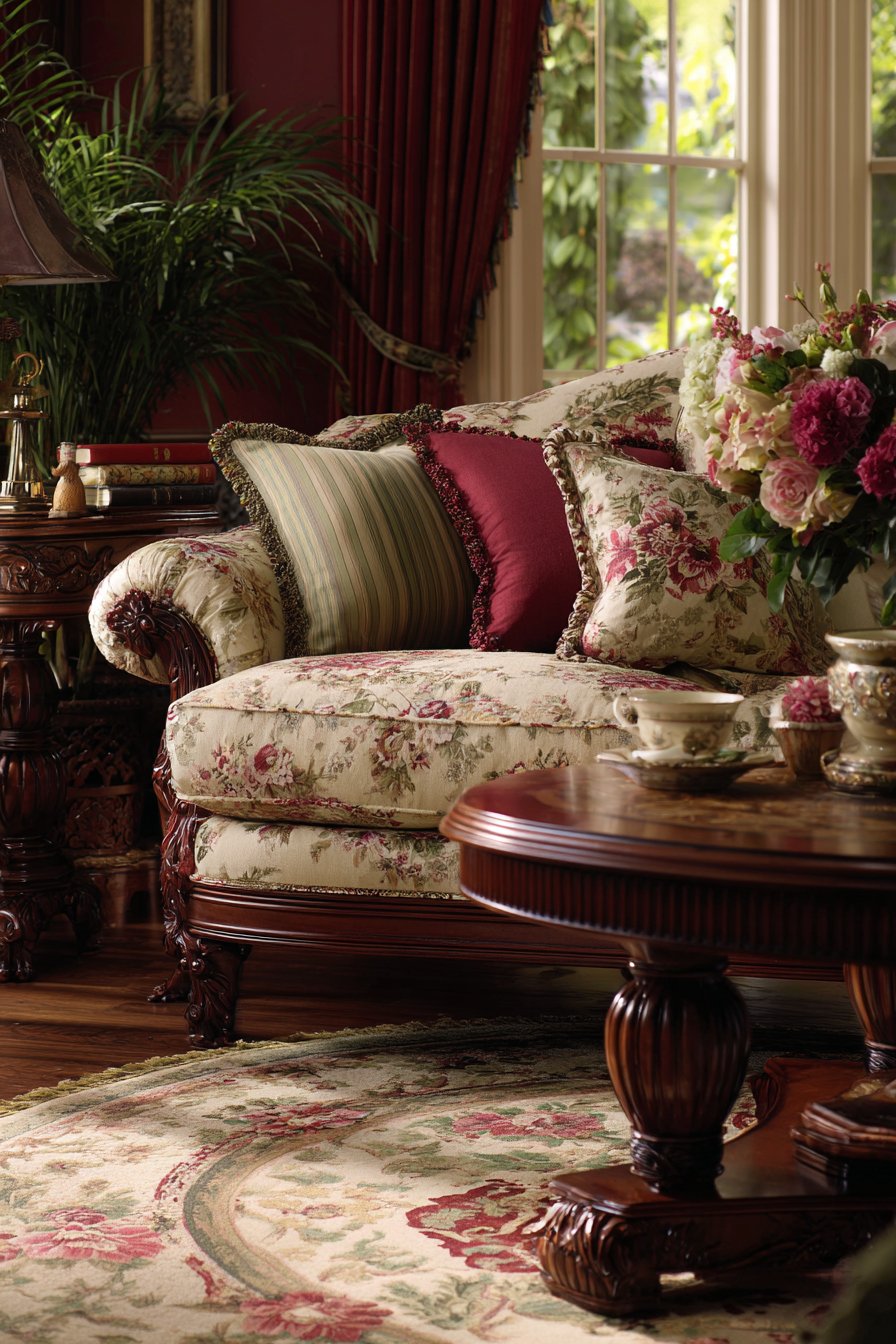 Floral chintz fabric brings traditional English country style beautifully. The pattern adds life and visual interest throughout the room. Coordinating solid silk pillows prevent pattern overwhelm. Exposed wood frames connect upholstery to traditional furniture design. Quality construction ensures comfort through years of family use.