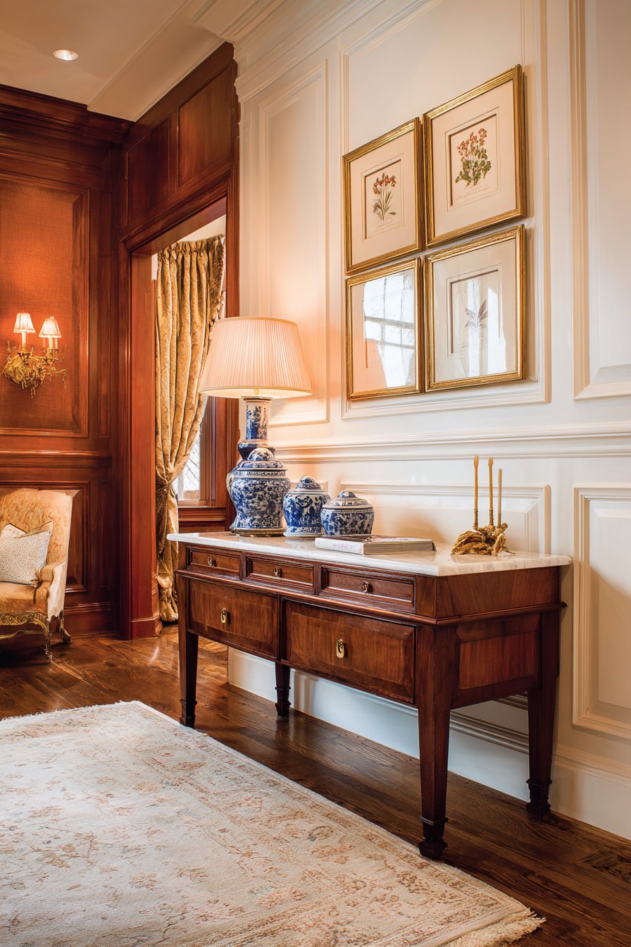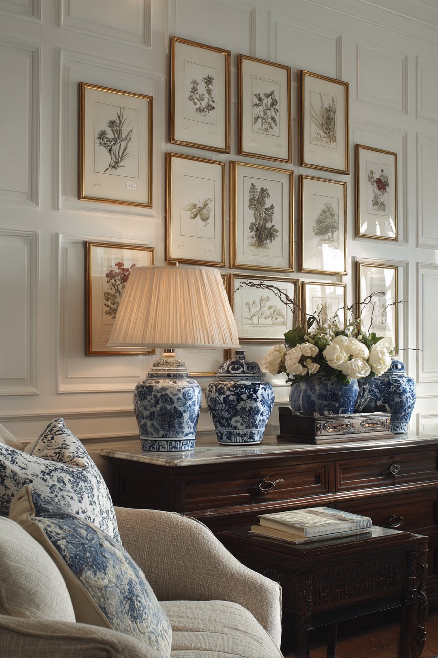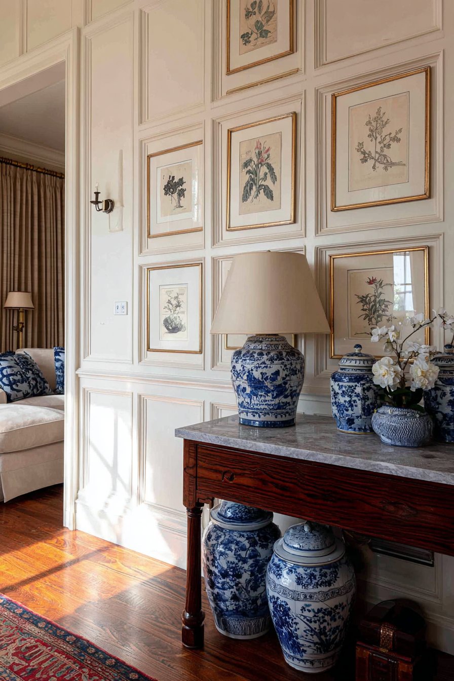 A mahogany console table with marble top sits below the artwork. Blue and white Chinese porcelain ginger jars create classic display. A traditional brass lamp with cream shade provides ambient lighting. The styling demonstrates collected traditional taste beautifully. Every element contributes to the refined atmosphere.