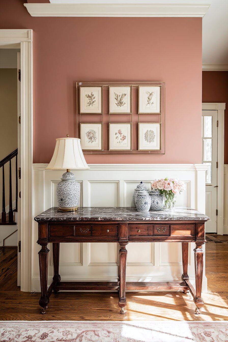 The wainscoting adds three-dimensional architectural texture to flat walls. Painted wood creates durable protection in high-traffic areas. The chair rail divides wall space at pleasing proportions. Botanical prints add natural beauty and cultural sophistication. The grid arrangement maintains traditional formal structure.