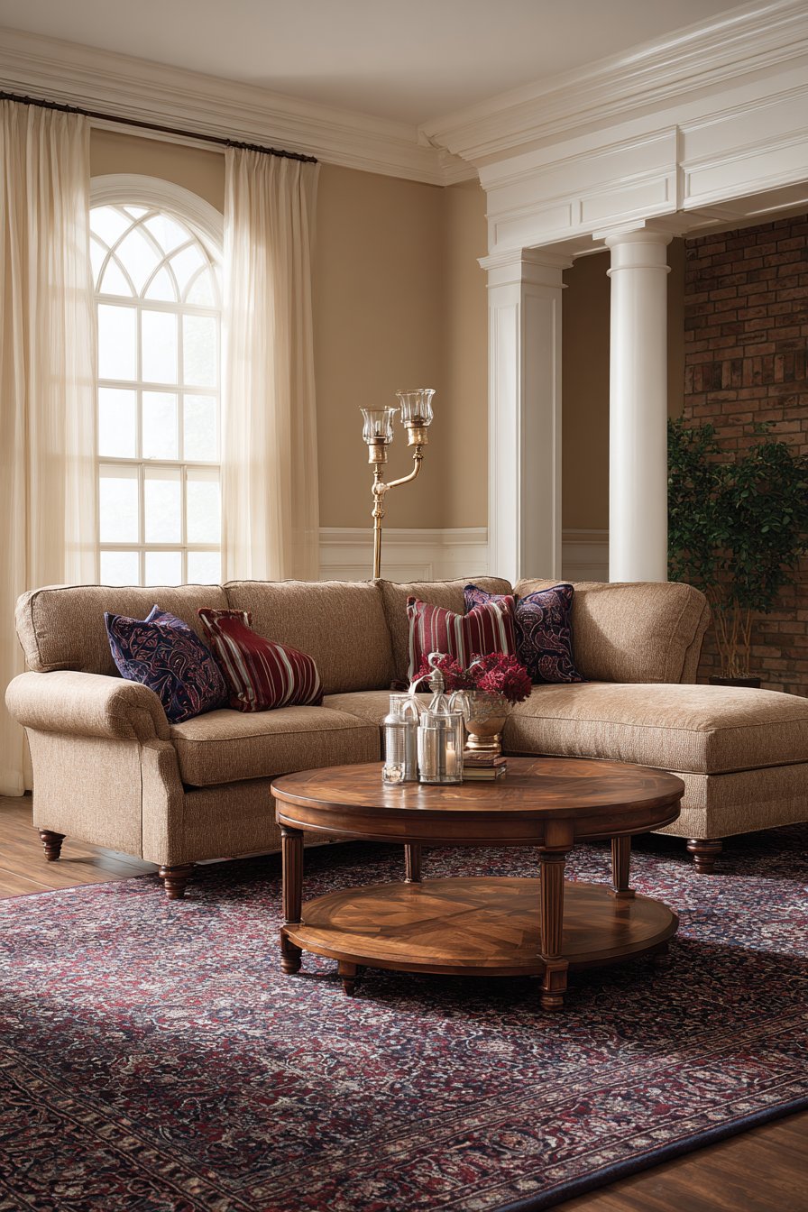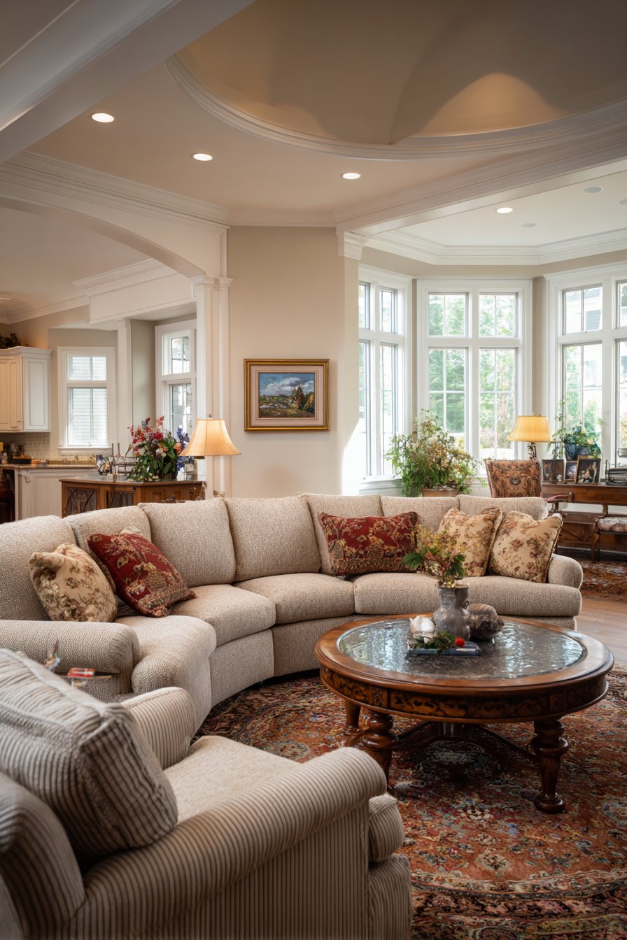 This living room balances comfort with traditional elegance successfully. The sectional accommodates family needs while maintaining style. Quality materials ensure longevity through daily use. Traditional accessories and finishes elevate the overall design. Everything works together for inviting sophistication.