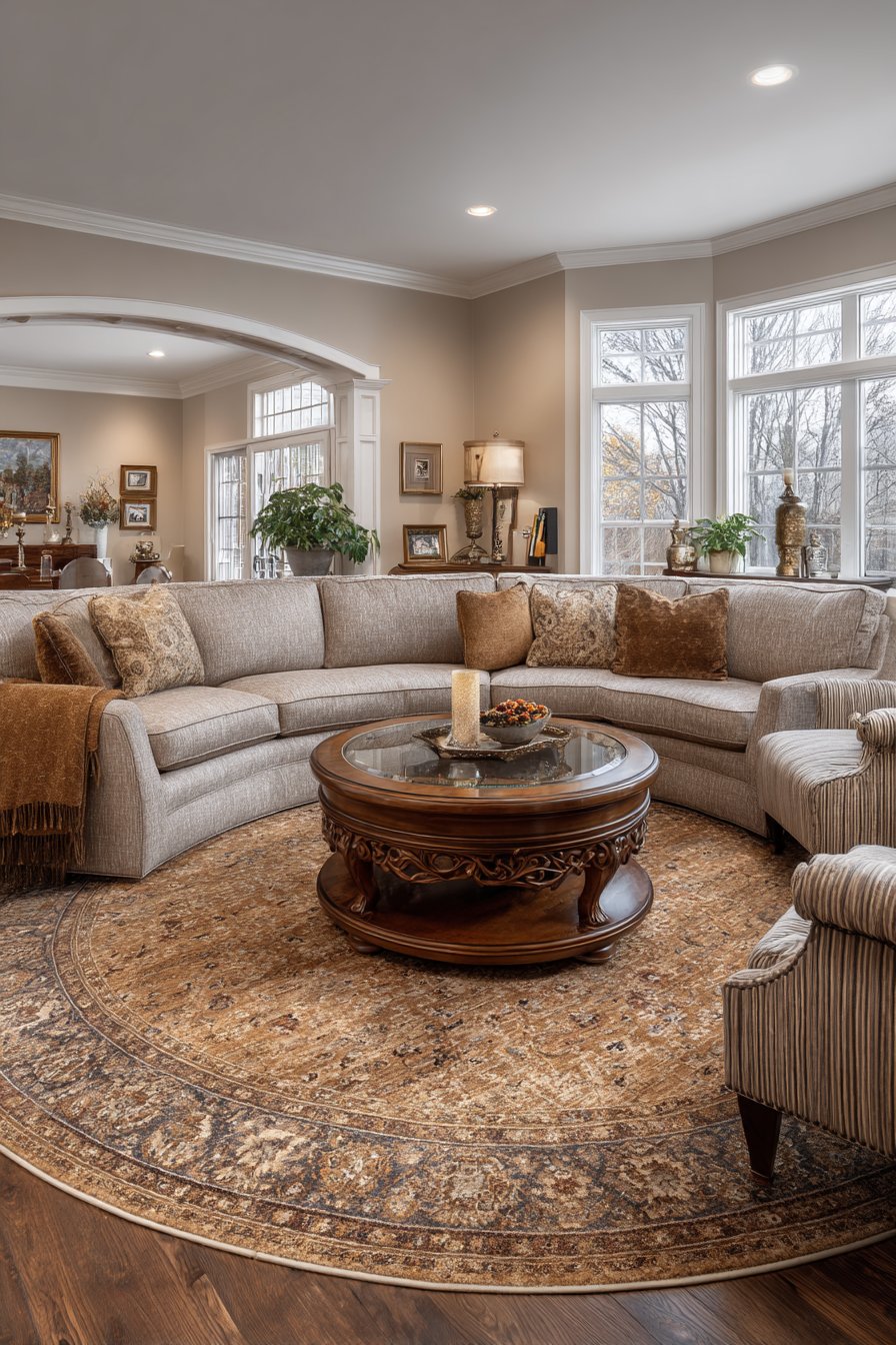 A semi-circular conversation area features a curved sofa in taupe linen. Coordinating armchairs in a complementary stripe pattern complete the grouping. They face an ornate carved wood coffee table with glass top. Traditional oval braided wool rug in earth tones defines the space. Behind the seating, a sofa table displays traditional accessories.
