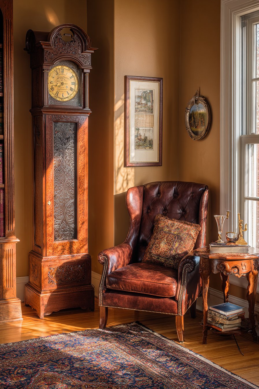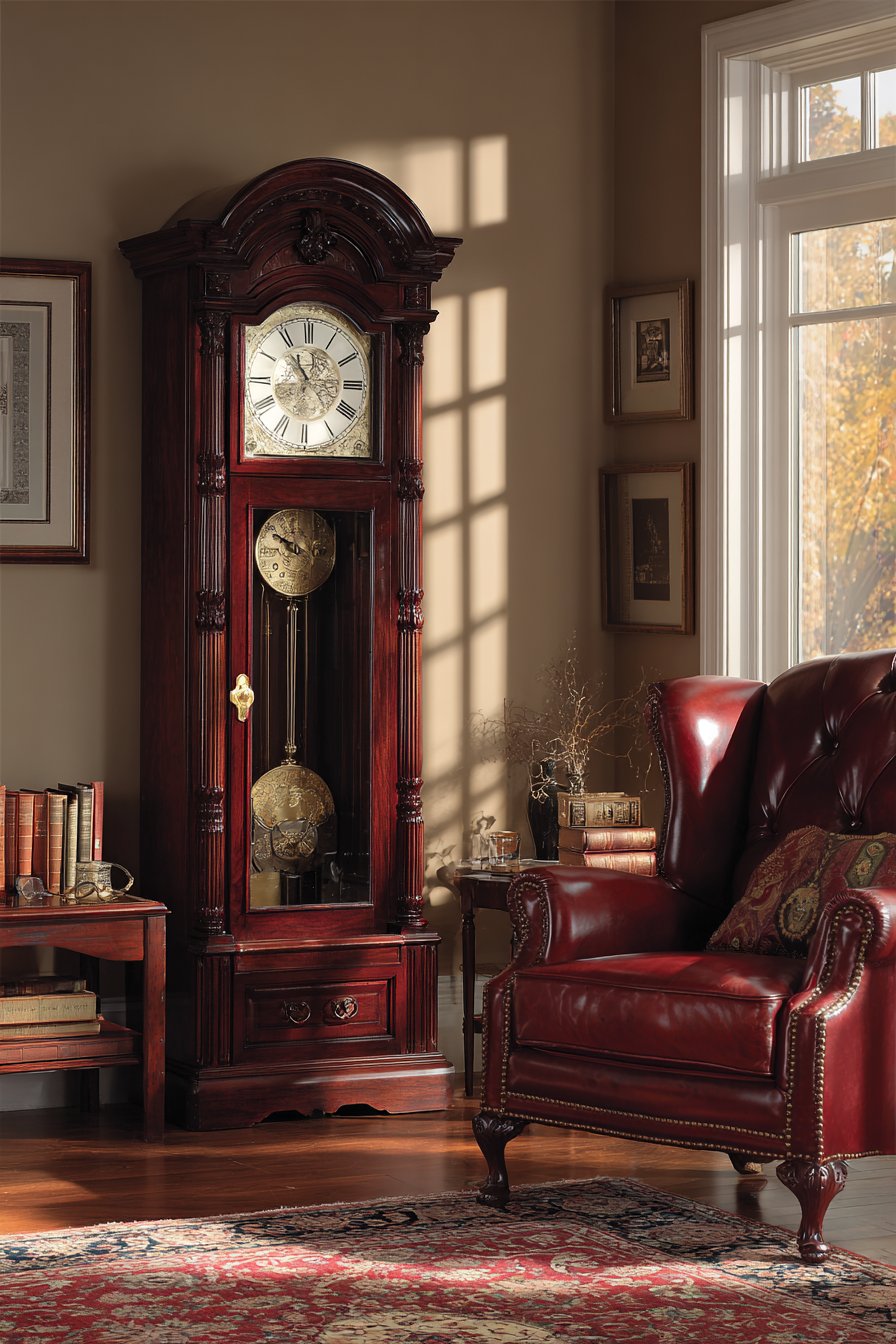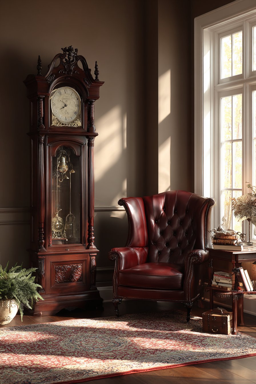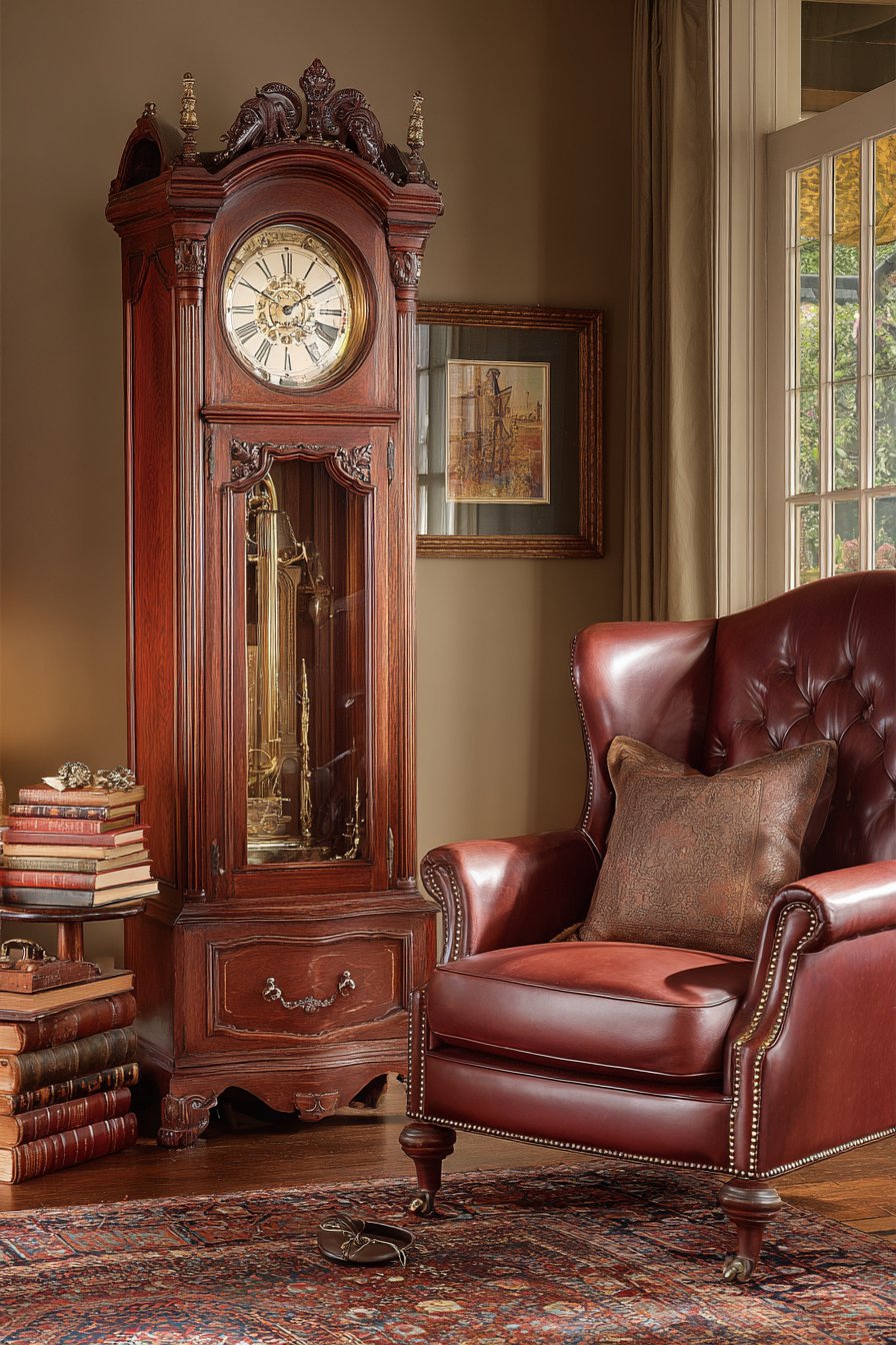 An antique grandfather clock in mahogany case stands against taupe walls. The brass dial and Westminster chime demonstrate quality clockmaking. Nearby sits a Queen Anne wing chair in burgundy leather. Brass nailhead trim outlines the traditional chair silhouette. A traditional side table holds antique books and reading glasses.