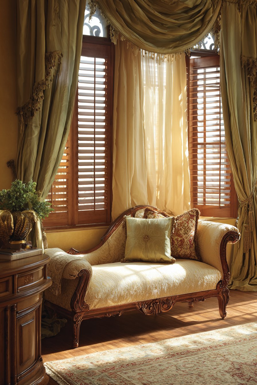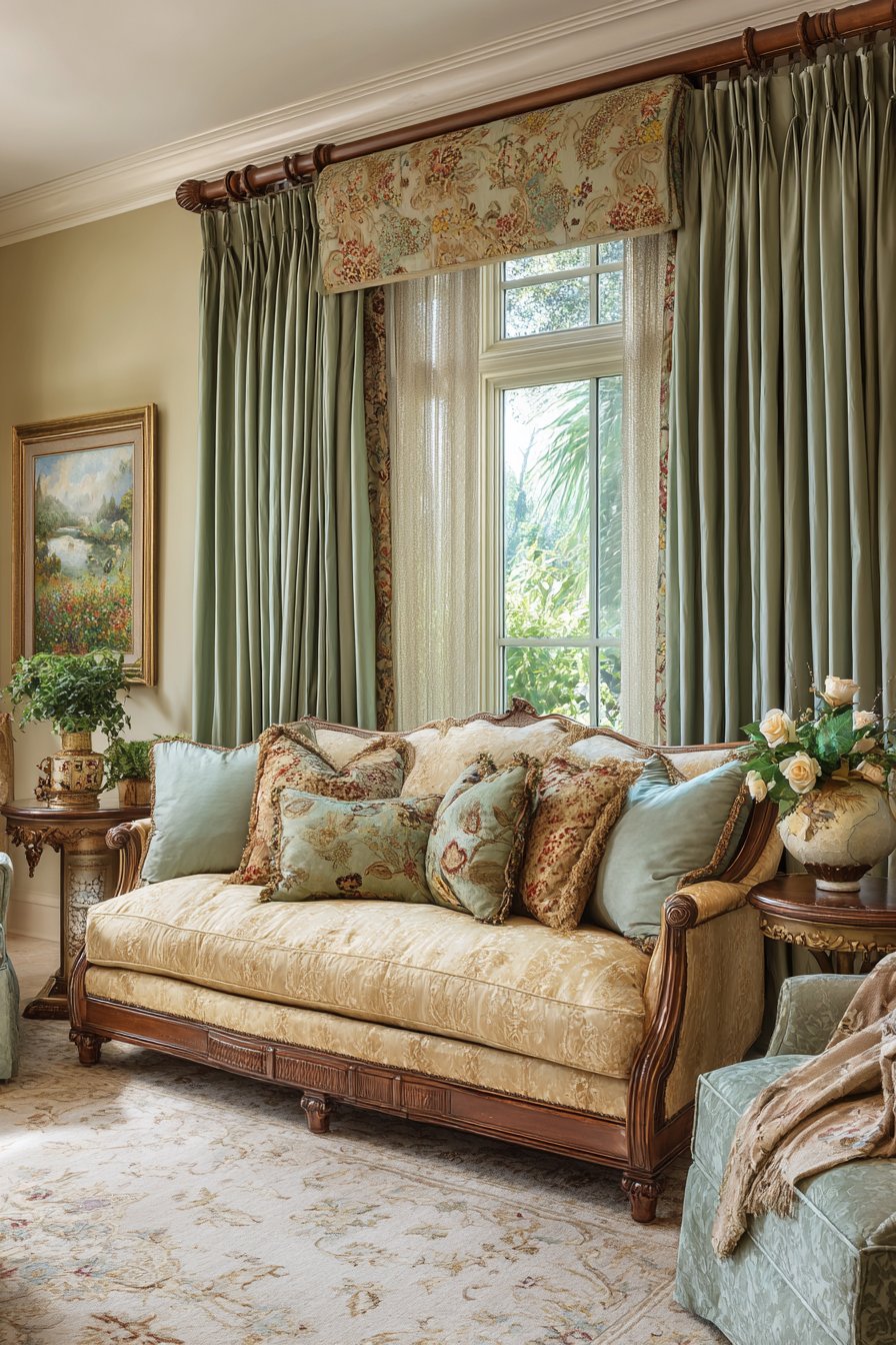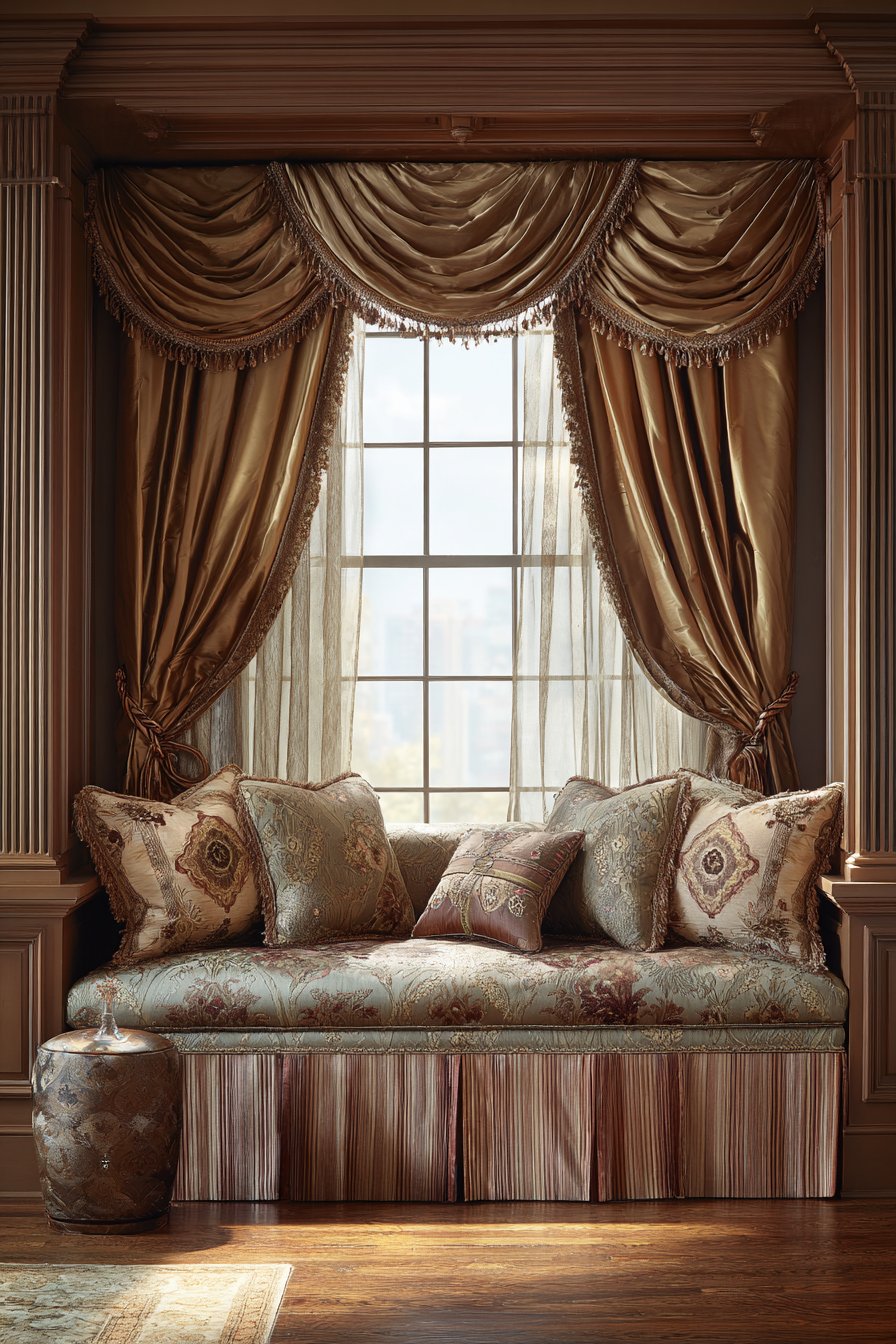 The carved wood frame features curved arms in traditional style. Multiple throw pillows in traditional patterns complete the window seat area. The layered treatment demonstrates traditional window dressing complexity. Afternoon light filters through the multiple fabric layers beautifully. The formal approach creates impressive architectural detail.