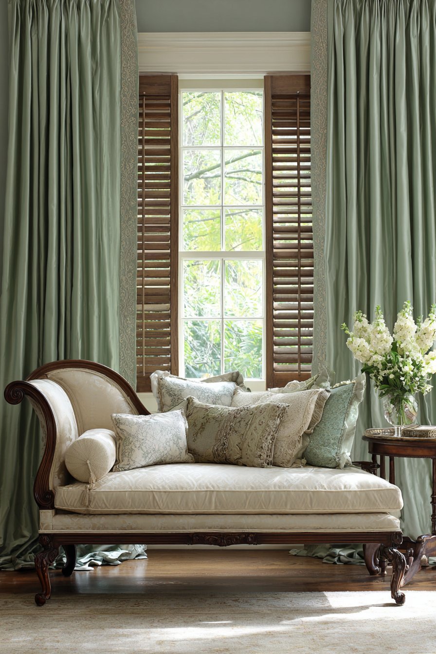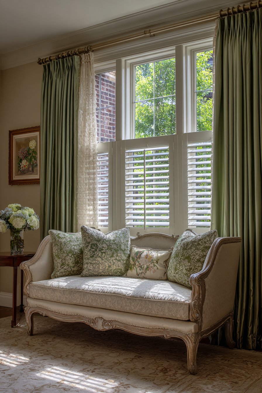 Windows feature wooden plantation shutters as the foundational layer. Floor-length pinch-pleat drapery panels in sage green silk top the shutters. A coordinating valance extends across the top treatment. Sheer undercurtains diffuse natural light between the layers. Before the window sits a traditional settee in cream fabric.