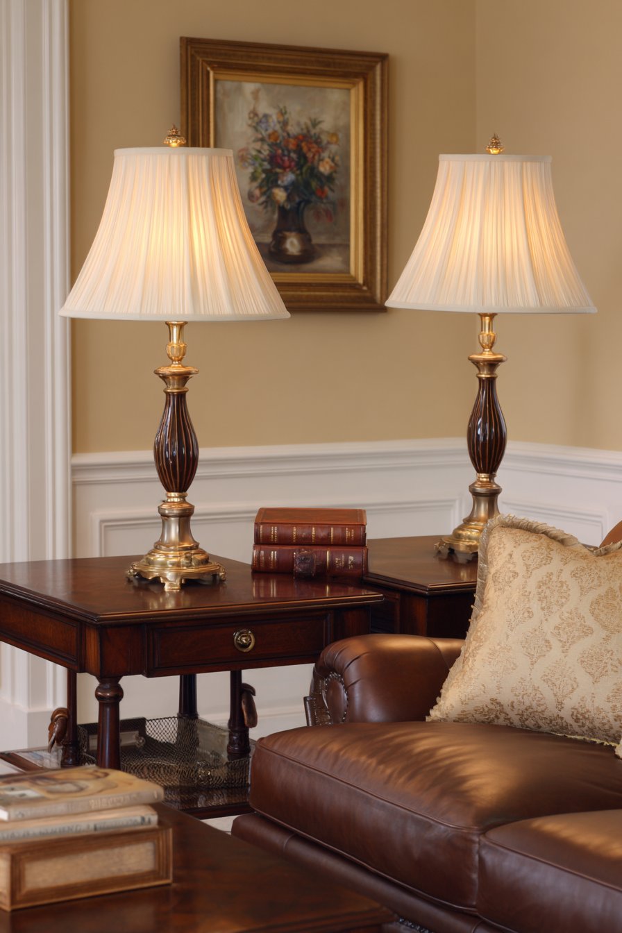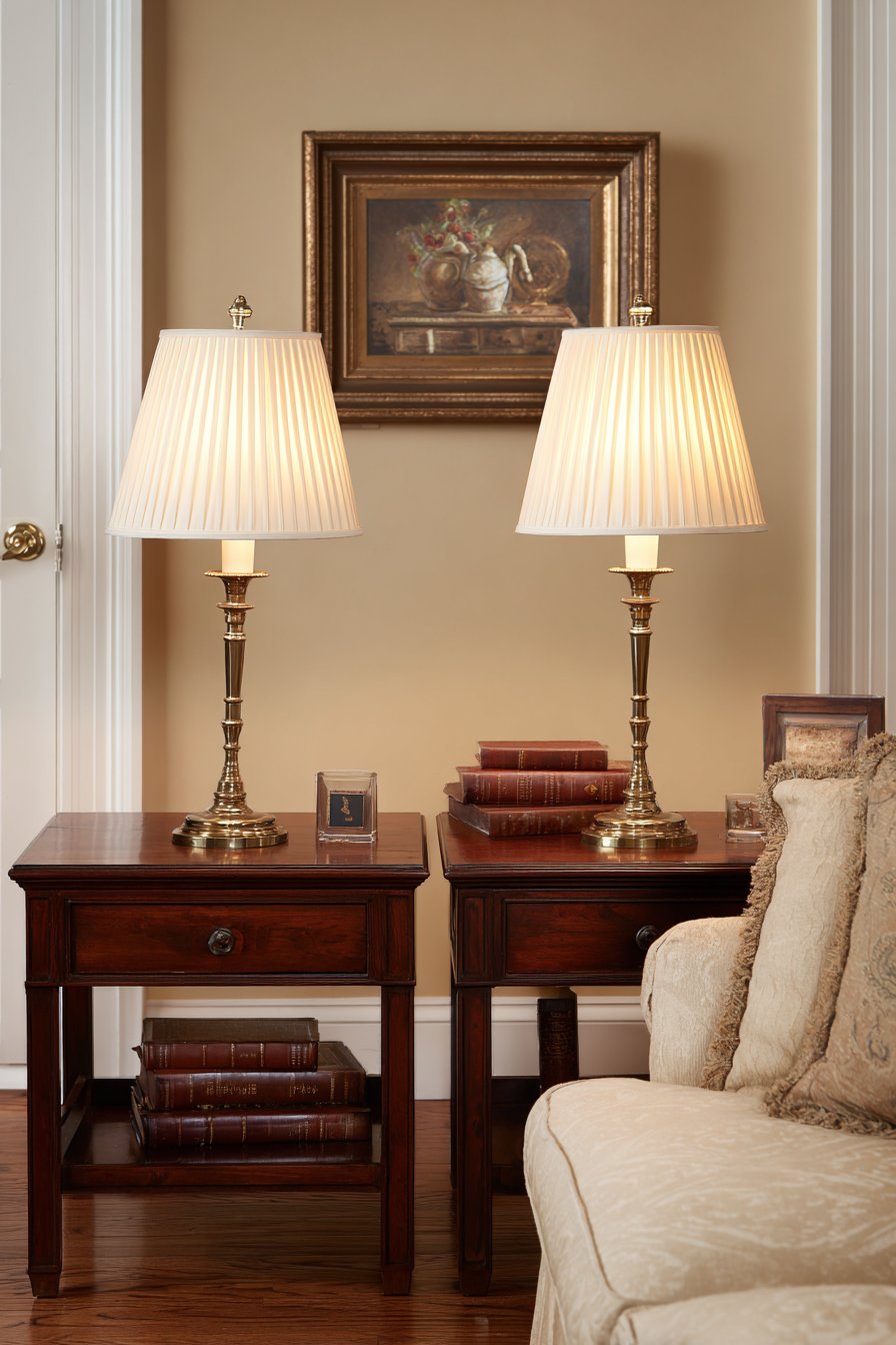 Matching table lamps reinforce traditional symmetry principles throughout the room. Brass candlestick bases add vertical interest and traditional detail. Pleated silk shades diffuse light softly for ambient illumination. The mahogany end tables provide functional surfaces and storage. Everything works together for balanced lighting design.
