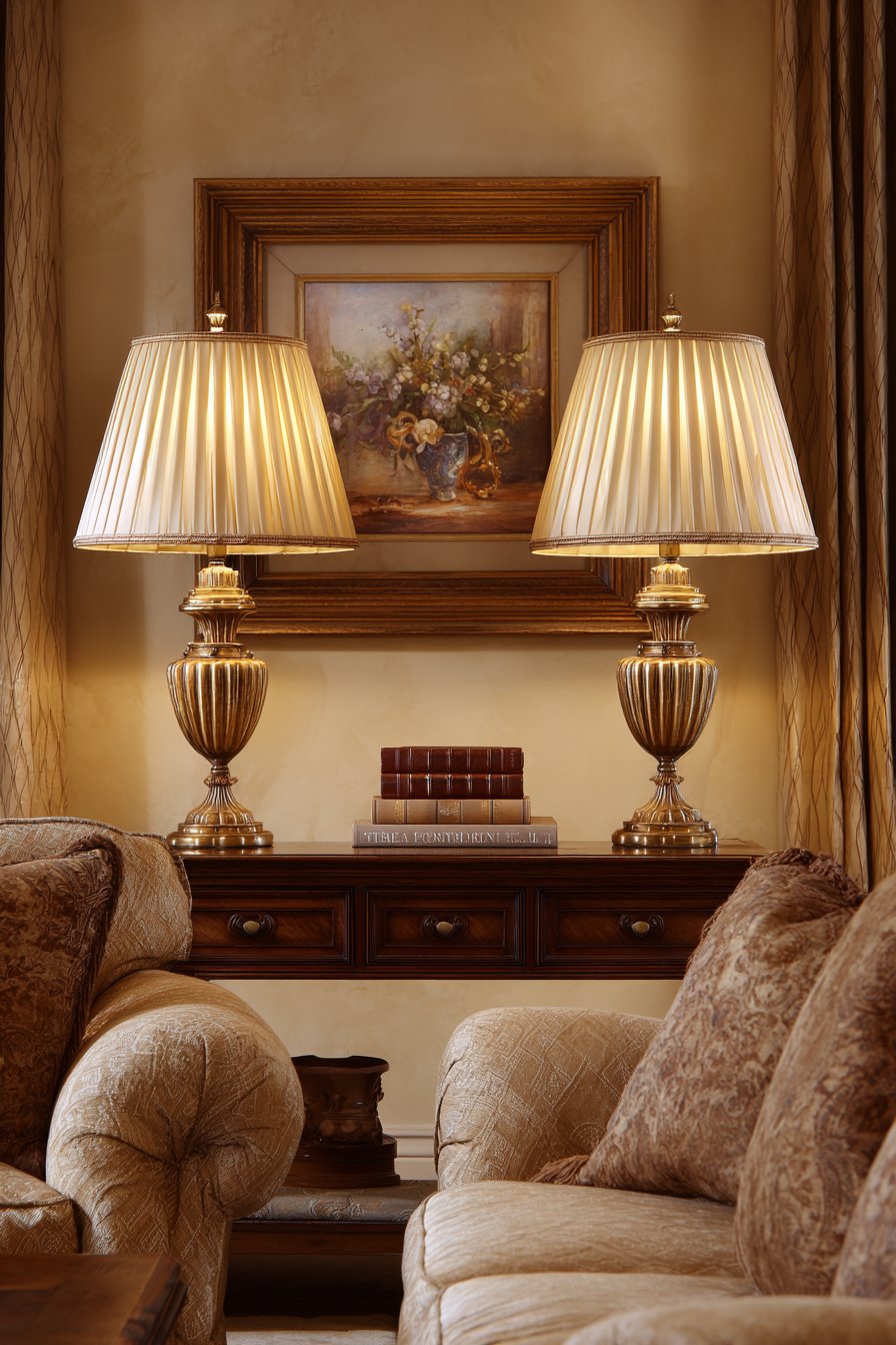 This lighting arrangement demonstrates traditional design’s emphasis on symmetry. Matching pairs create visual harmony and formal structure. Quality brass hardware and silk shades represent an investment in lasting beauty. The warm ambient light enhances traditional atmosphere. Functional lighting combines with decorative appeal perfectly.