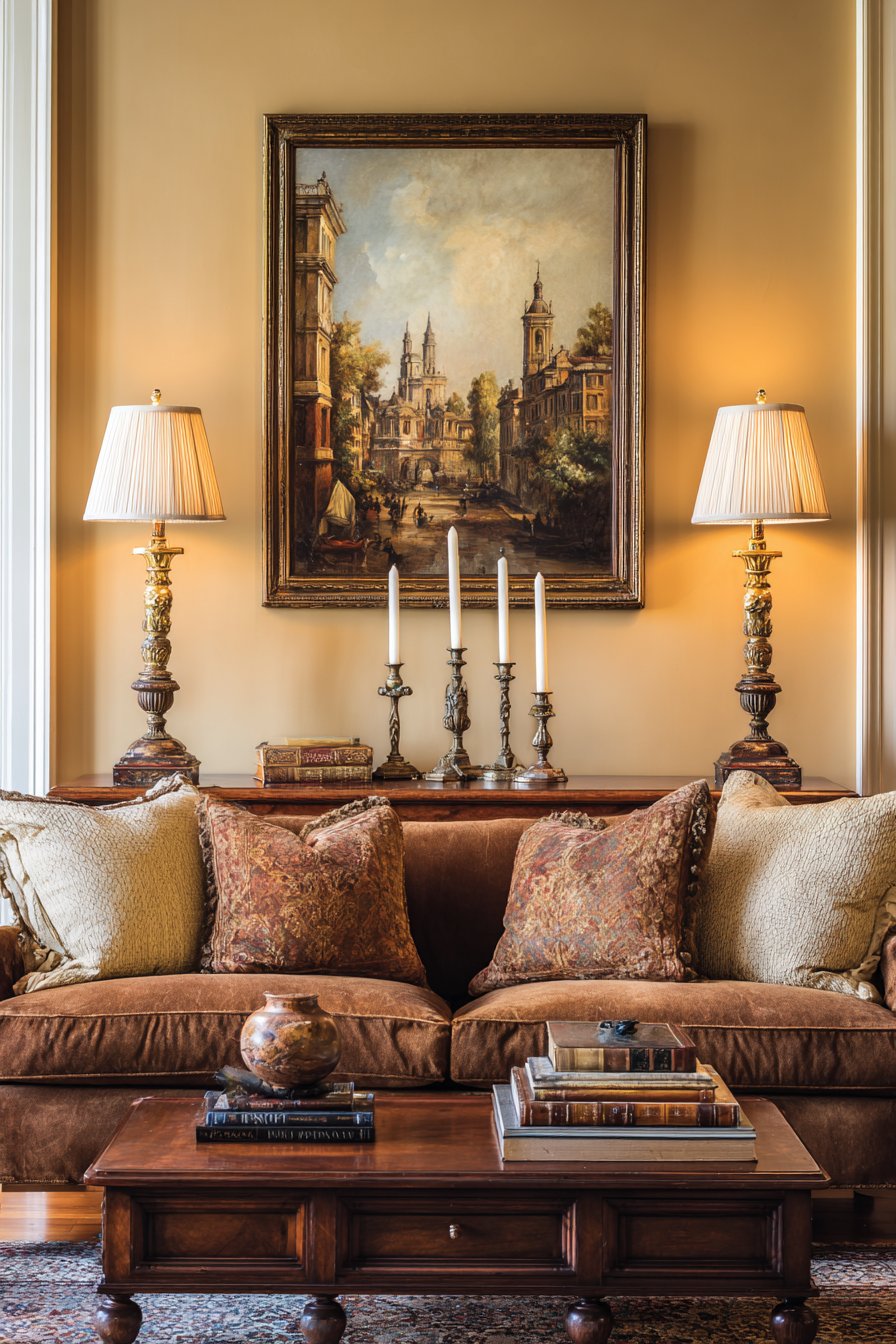 Walls painted in warm beige provide neutral backdrop for the arrangement. A traditional still life oil painting hangs centered above the sofa. The symmetrical layout creates balanced formal composition. When illuminated, the lamps cast warm ambient light. The traditional setting glows with welcoming sophistication.