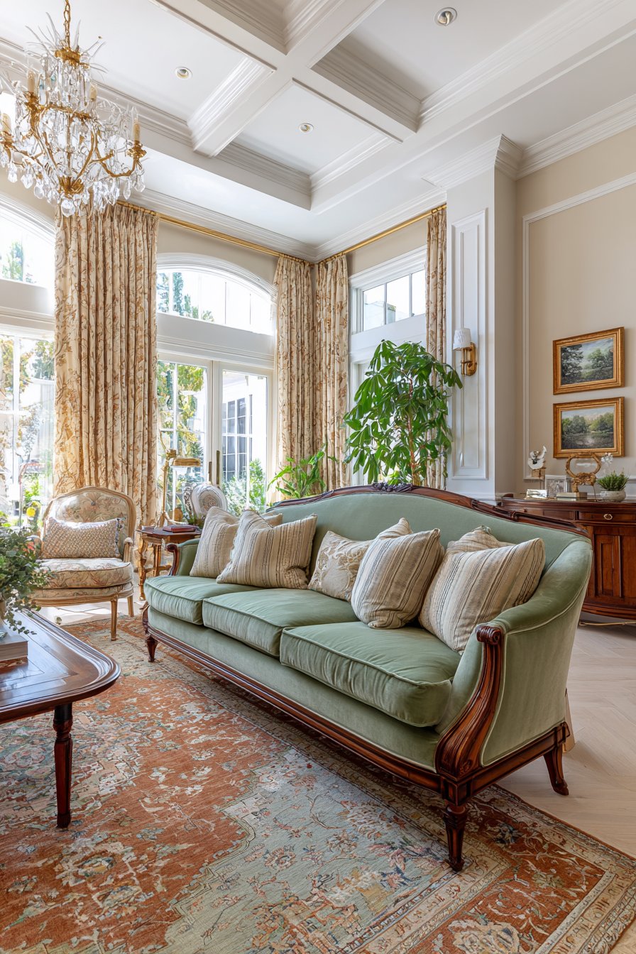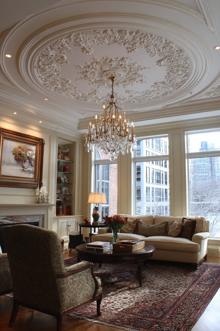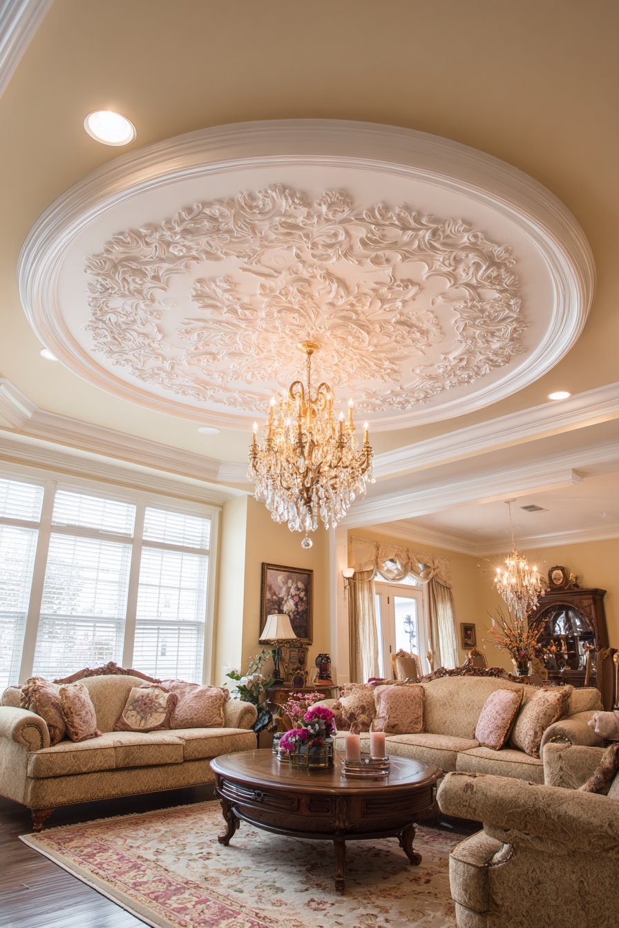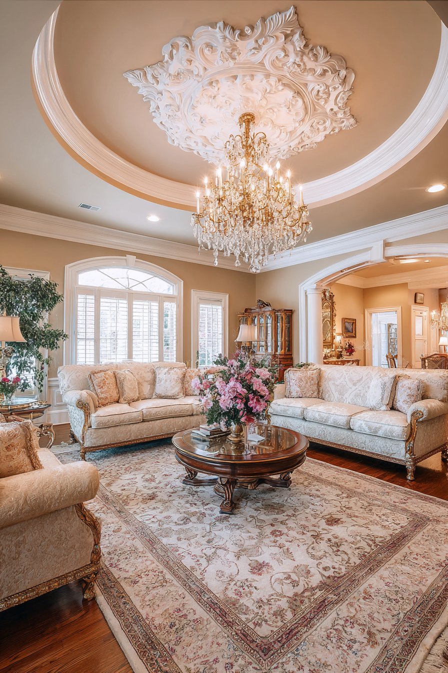 Below, traditional furniture arrangement includes matching sofas and coordinating chairs. They sit atop an oriental rug in traditional patterns. The overhead chandelier serves as jewelry for the room. Natural light supplements the fixture’s illumination during daytime. The ceiling treatment demonstrates traditional attention to overhead elements.