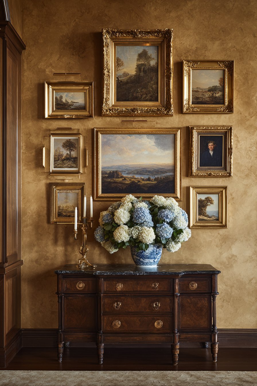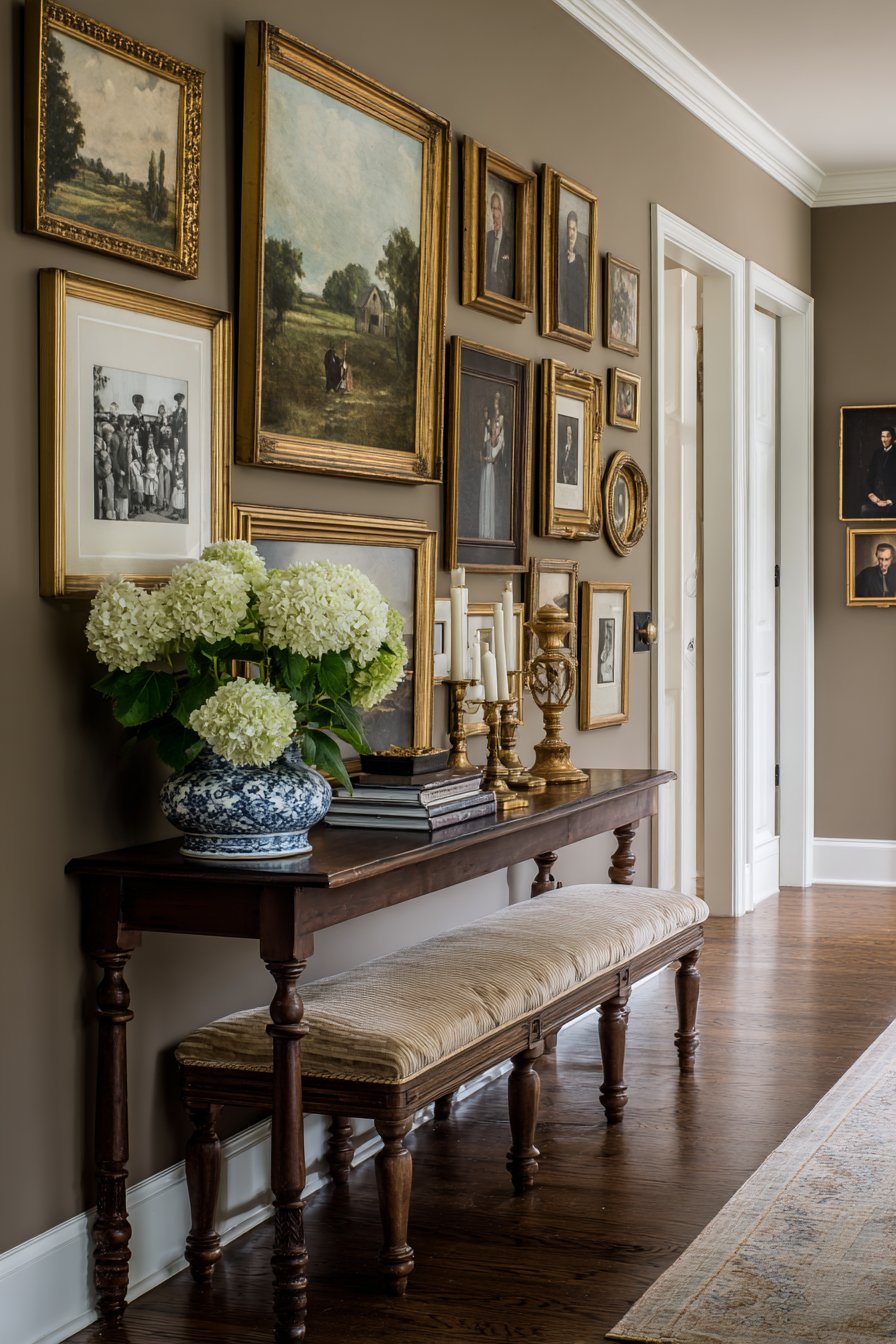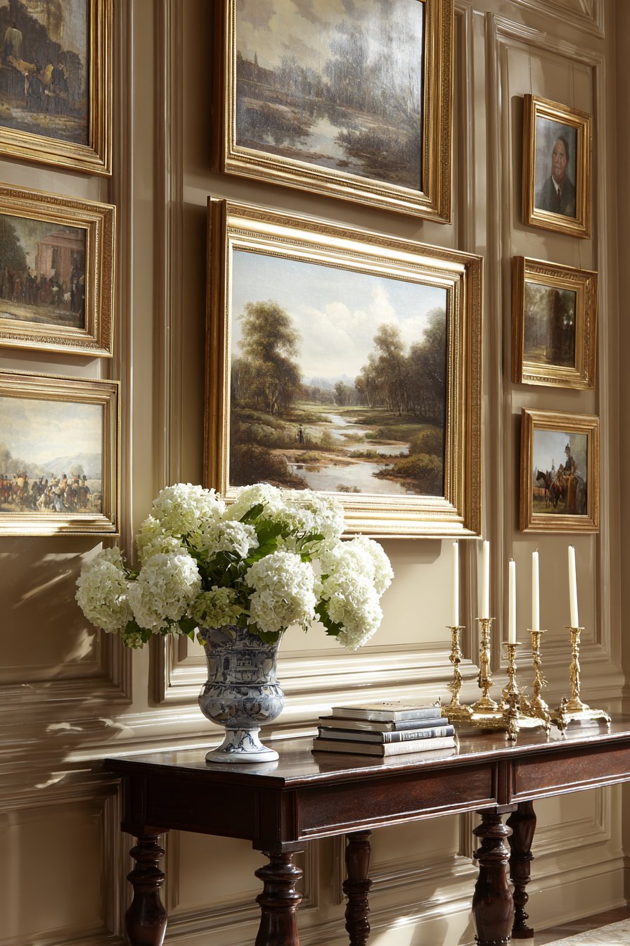 Below the gallery wall sits a mahogany console table. Turned legs showcase traditional woodworking techniques beautifully. Brass candlesticks stand at attention on either side. A porcelain vase holds fresh hydrangeas in soft colors. The styling creates a collected-over-time appearance that feels authentic.