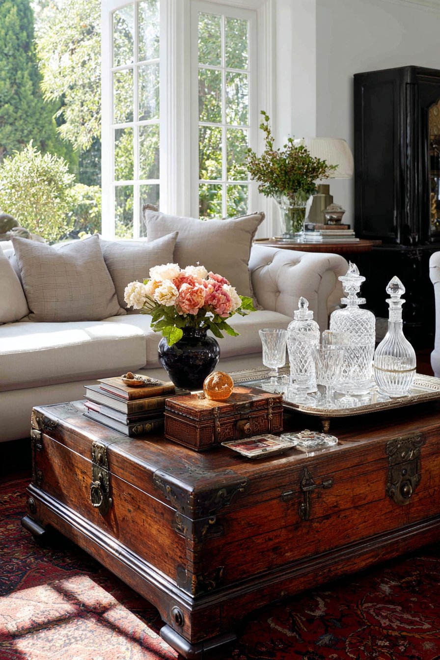 The layered approach creates a collected-over-time appearance naturally. Each item has purpose beyond pure decoration. Books provide reading material and visual weight. Boxes offer concealed storage for remote controls. Decanters add a traditional hospitality element. Everything combines for lived-in elegance.