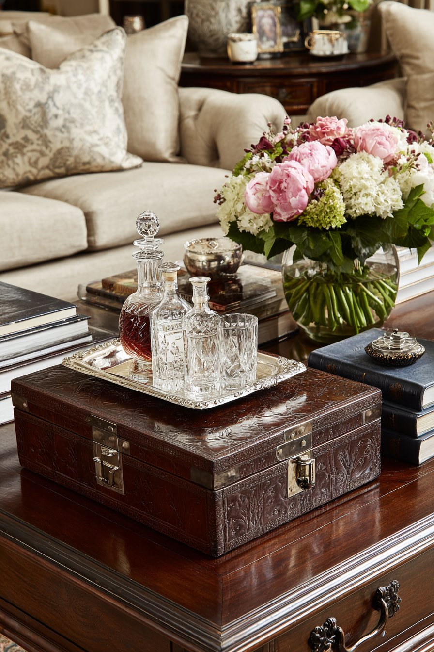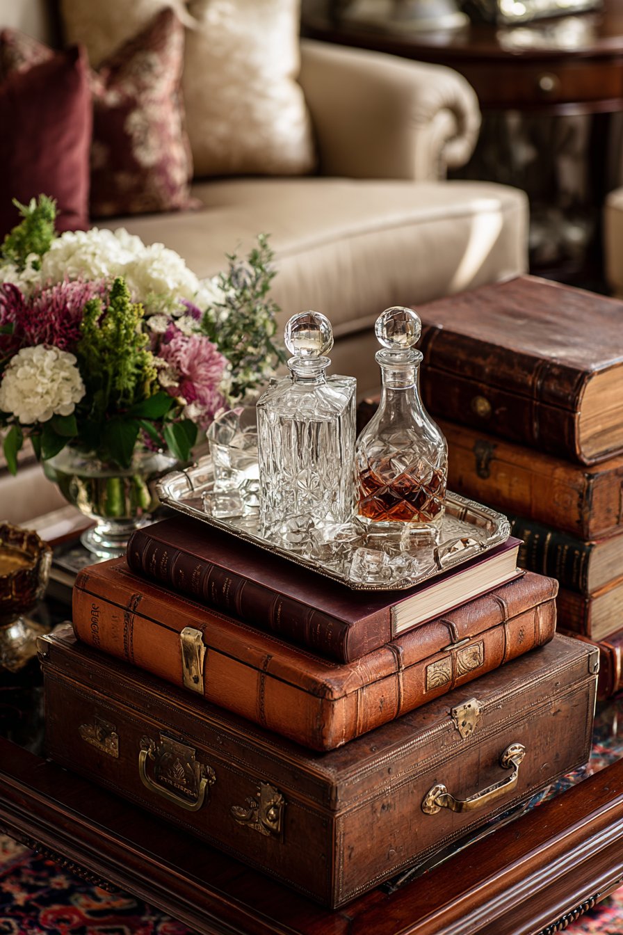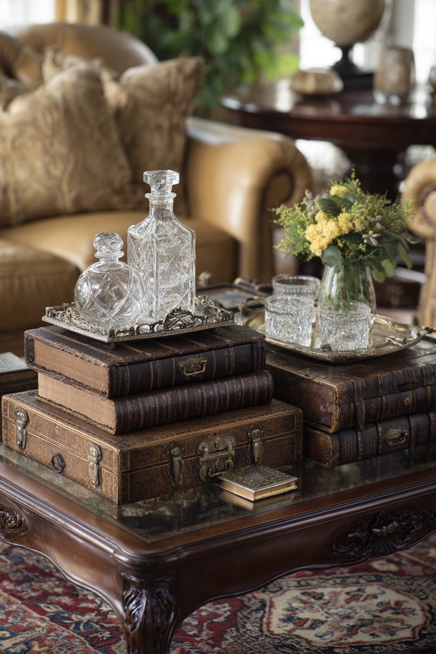 A coffee table arrangement features stacked leather-bound books as foundation. Antique wooden boxes with brass hardware add layers above. A silver tray holds crystal decanters for elegant display. Fresh flowers in a crystal vase bring life and color. Traditional coasters protect the mahogany surface beneath.