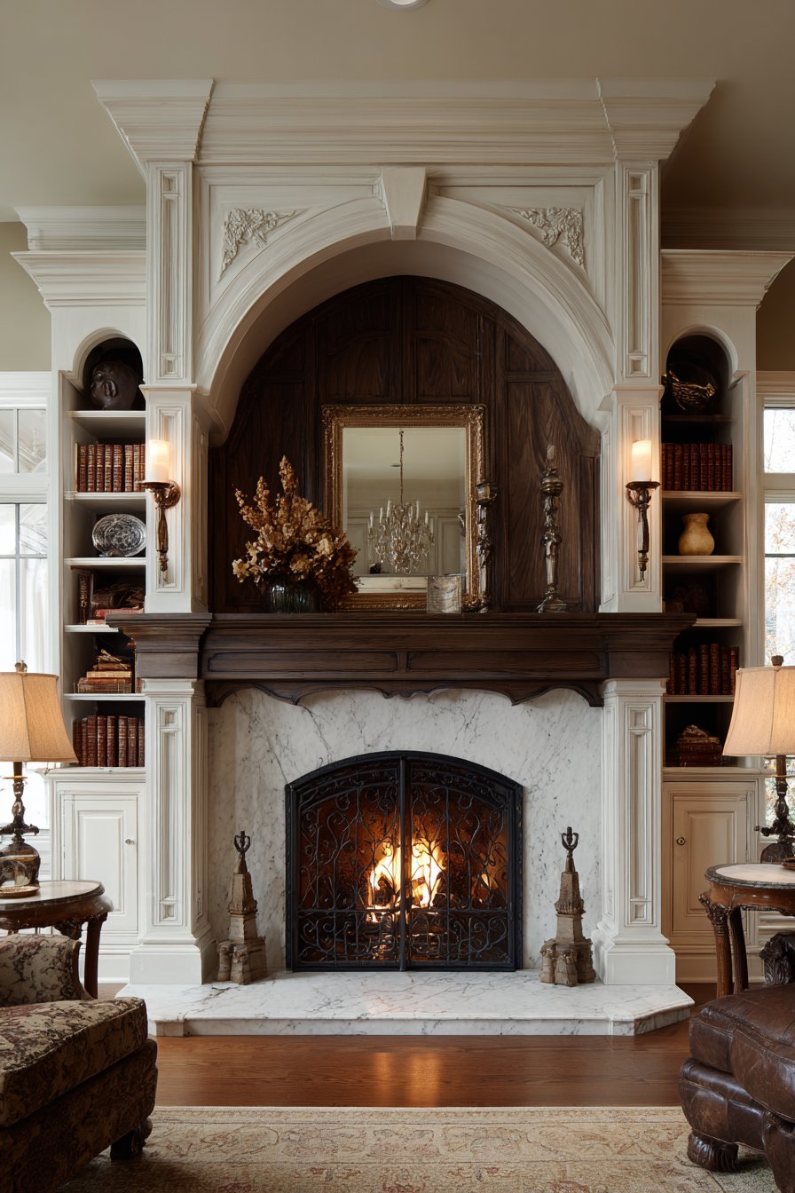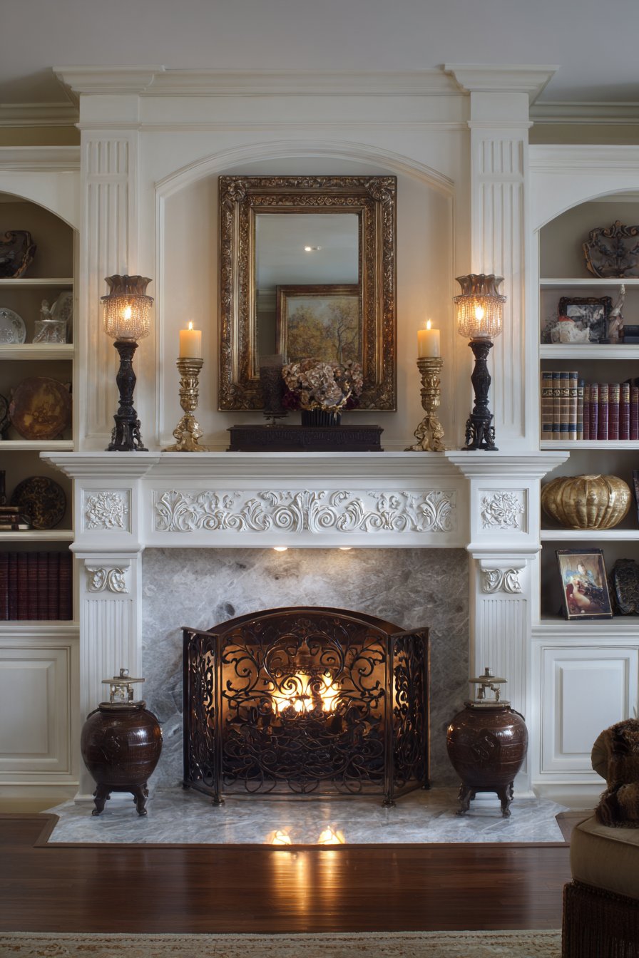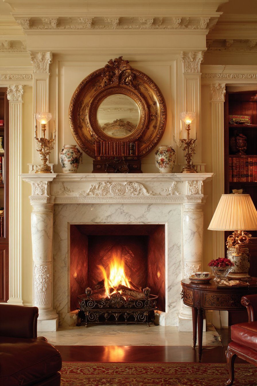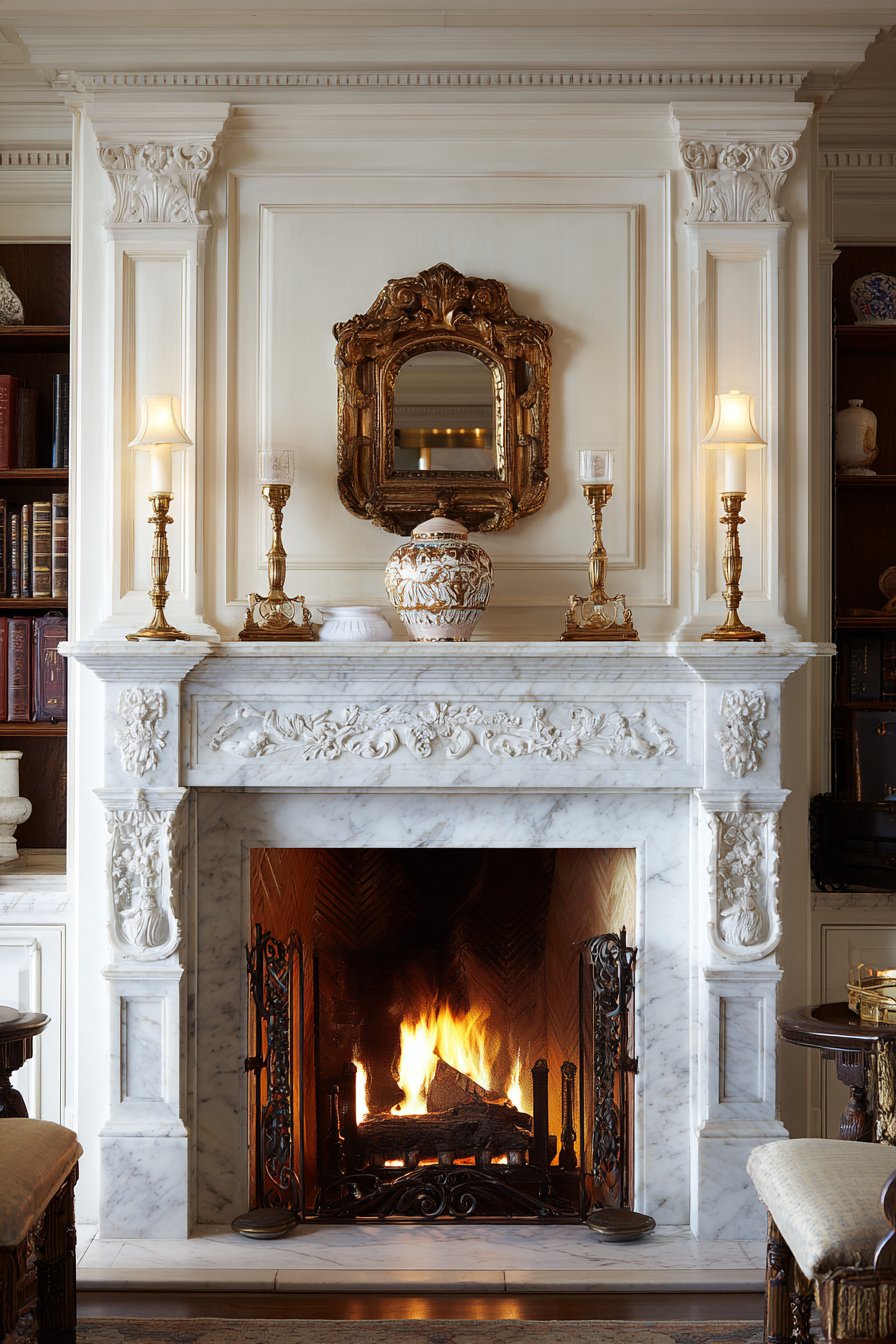 This fireplace design showcases traditional craftsmanship at its finest. The carved marble demonstrates skilled artisan work. Quality materials ensure longevity and timeless beauty. The symmetrical styling creates formal elegance throughout. Everything balances perfectly for visual harmony.