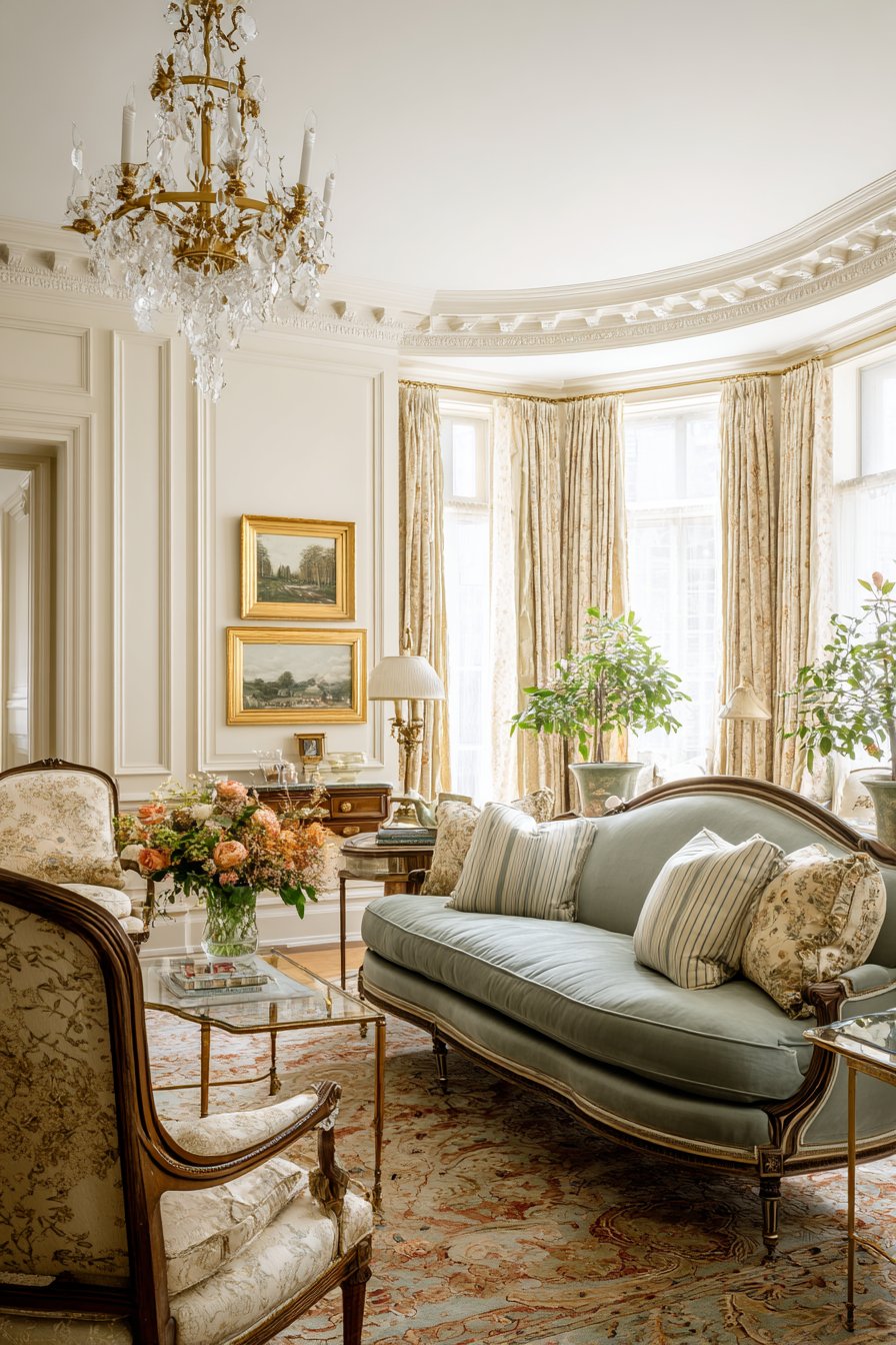 A beautiful camelback sofa upholstered in sage green velvet takes center stage. The carved walnut frame features exposed wood details throughout. Classic proportions demonstrate timeless furniture design principles. Coordinating bergère chairs with cane backing completes the seating arrangement. Striped silk cushions add pattern and comfort.