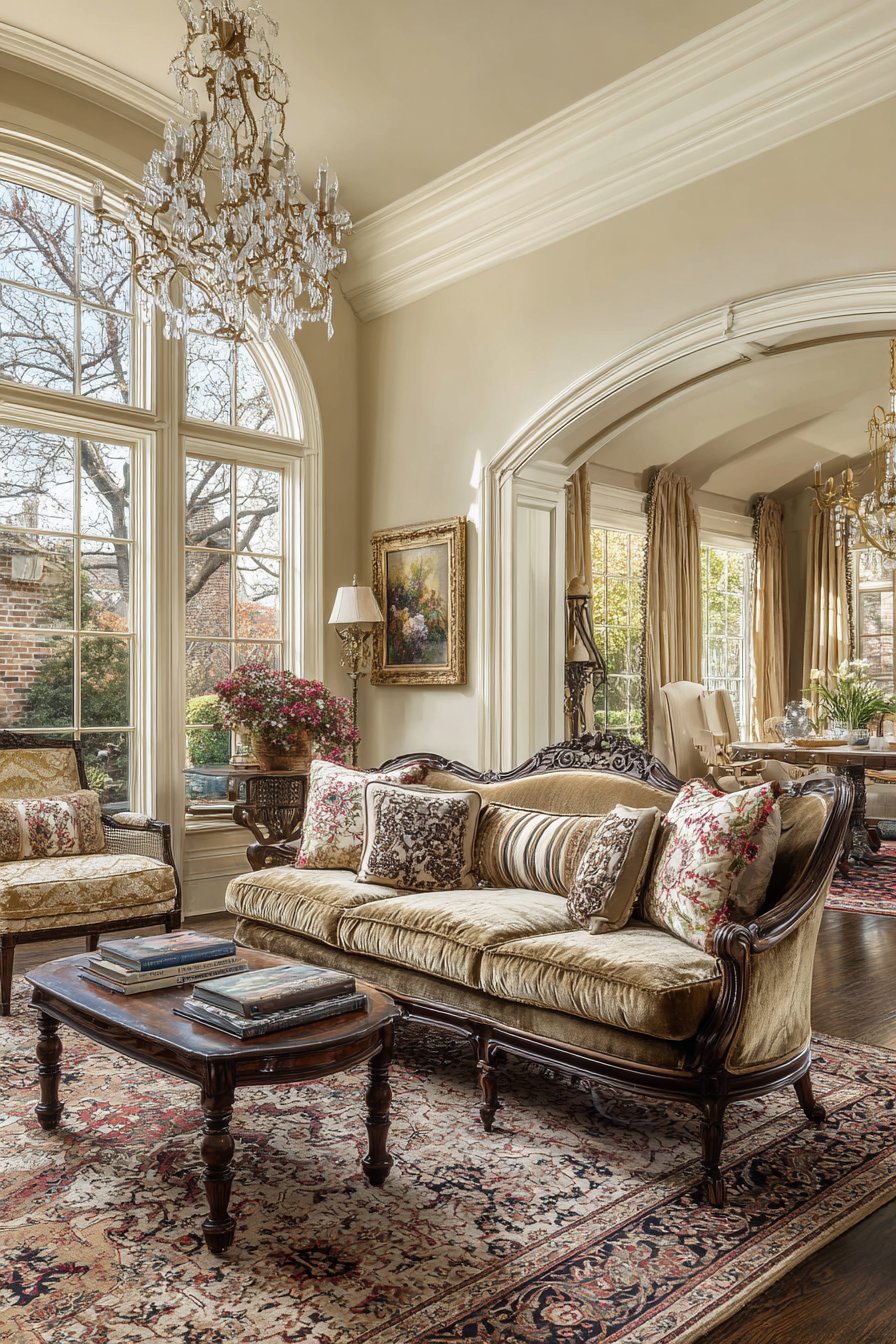 Pattern layering through Oriental rugs, damask upholstery, and chintz fabrics adds visual richness. Traditional design embraces multiple patterns when unified by coordinating colors. The complexity creates sophisticated spaces with depth and character. Texture variation through silk, velvet, carved wood, and crystal prevents visual monotony in neutral schemes.