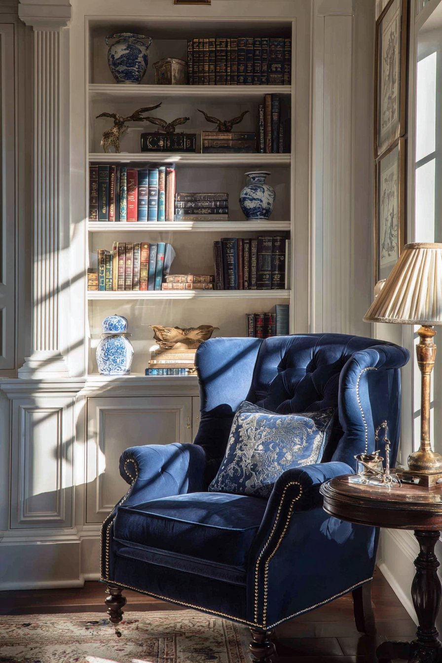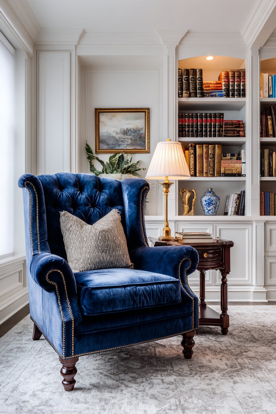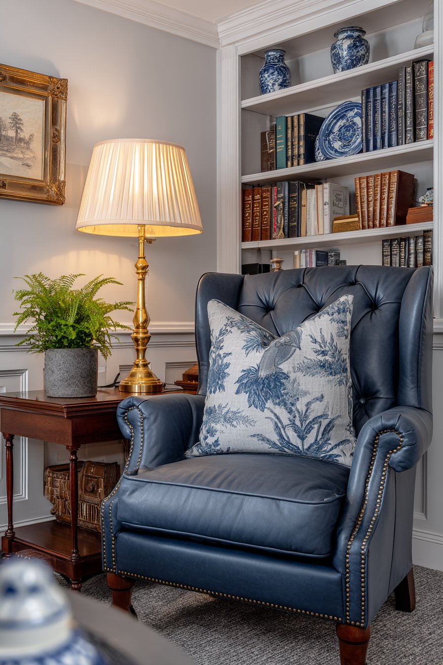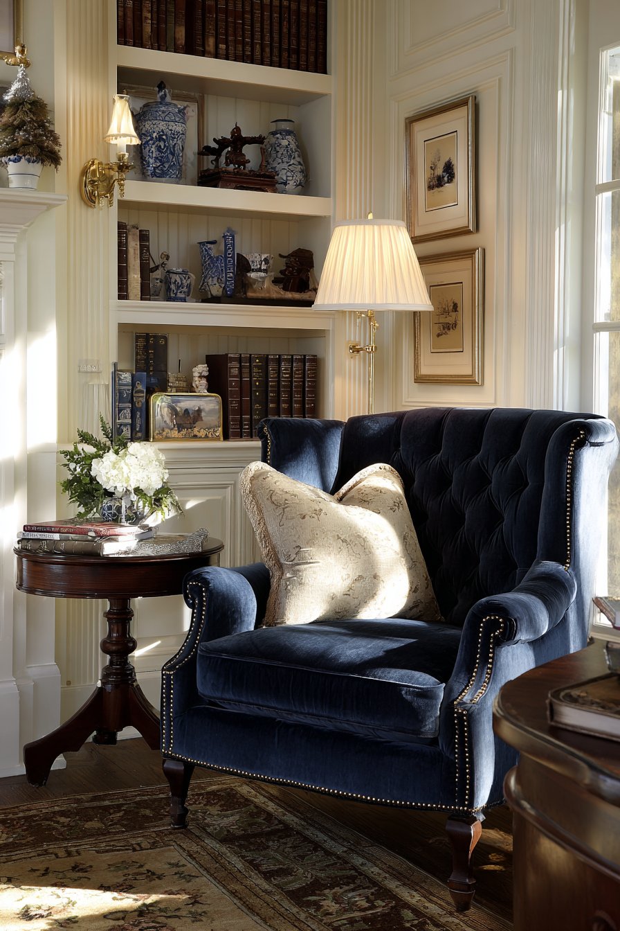 A cozy corner features a tufted wingback chair in classic navy blue. Nailhead trim outlines the chair’s traditional silhouette beautifully. A mahogany side table with barley twist legs sits beside it. The turned wood details showcase traditional craftsmanship perfectly. A brass floor lamp with pleated silk shade provides task lighting.