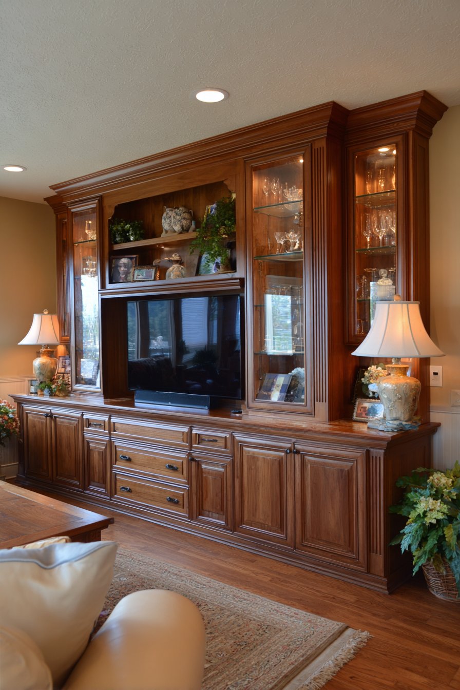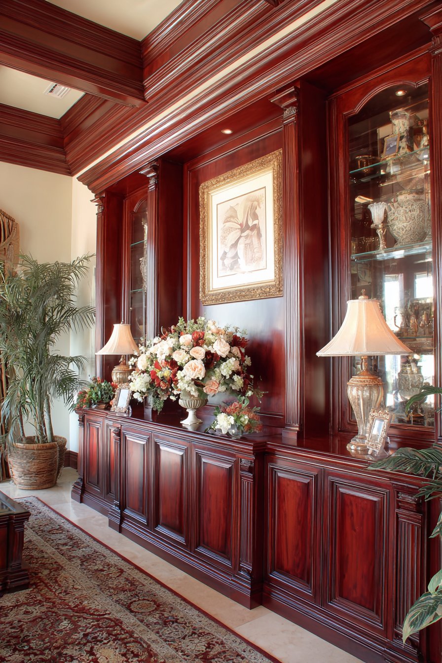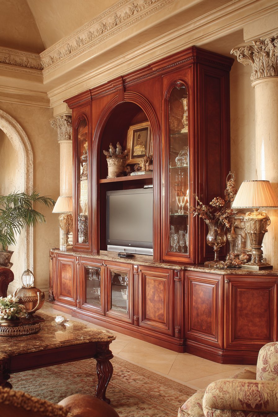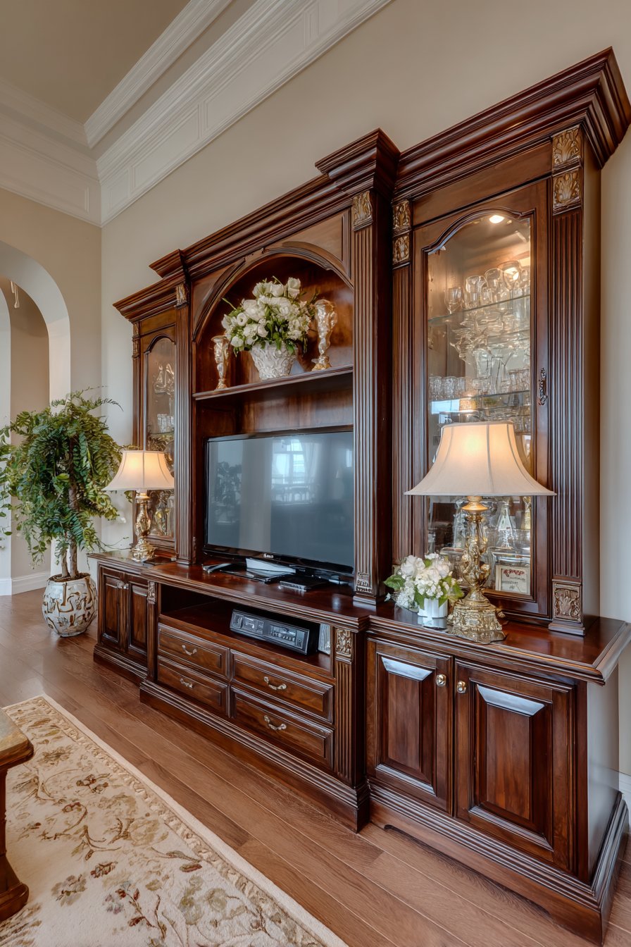 A substantial cherry wood entertainment center dominates one wall impressively. Glass-front cabinets display china and crystal collections beautifully. The integrated television space balances modern function with traditional style. Lower storage features raised panel doors with brass hardware. Dentil molding details enhance the traditional aesthetic throughout.