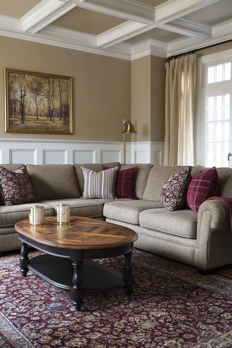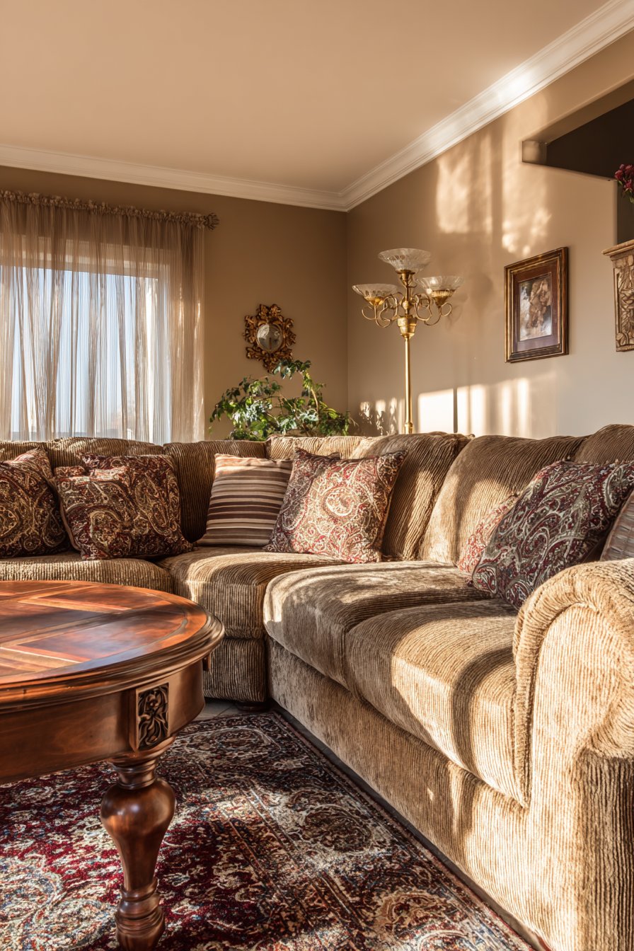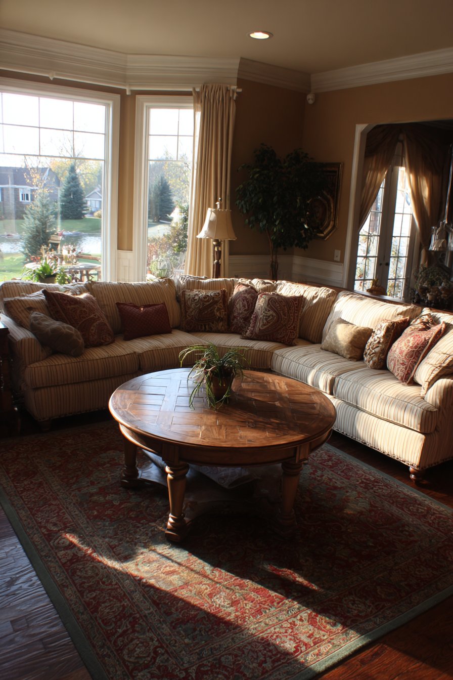 A large sectional sofa in camel-colored chenille provides ample seating. Rolled arms and turned wood feet maintain traditional character. The substantial piece invites family gathering and comfortable relaxation. An oval coffee table with inlaid wood parquet top sits at center. Multiple throw pillows in paisley and striped patterns add layers.