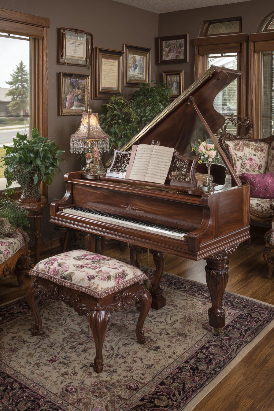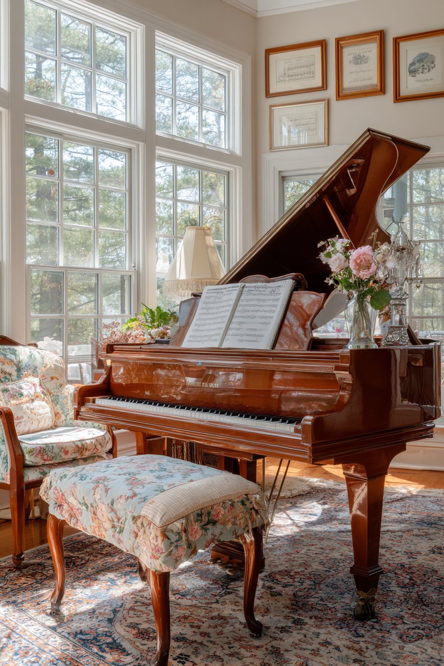 A baby grand piano in a polished mahogany finish commands this dedicated area. The glossy surface reflects light beautifully throughout the day. A traditional bench with needlepoint cushion sits before the keys. Behind the piano, framed vintage sheet music adorns the walls. The coordinating frames create an intentional music-themed display.