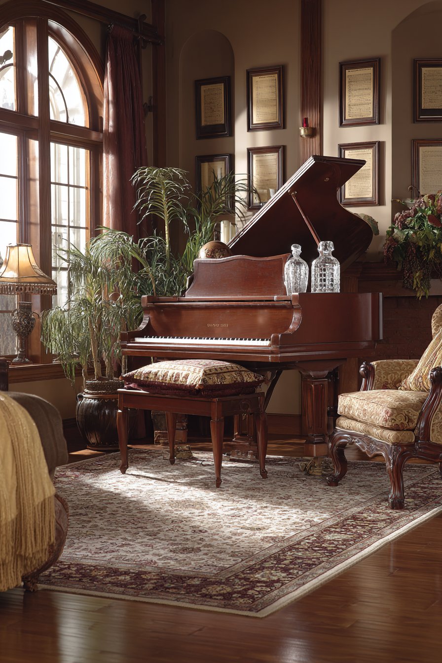 This dedicated piano area demonstrates thoughtful space planning. The oriental rug protects flooring while defining the zone. Traditional furniture complements the piano’s formal presence. Quality materials create an environment worthy of musical performances. The space feels both functional and beautifully designed.