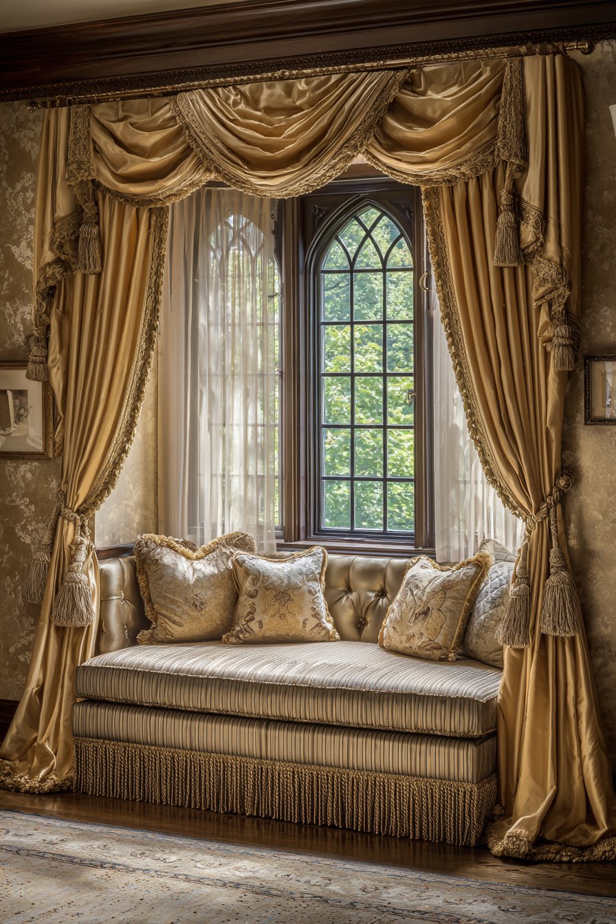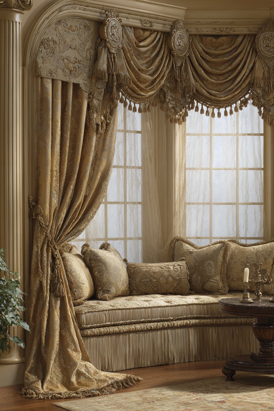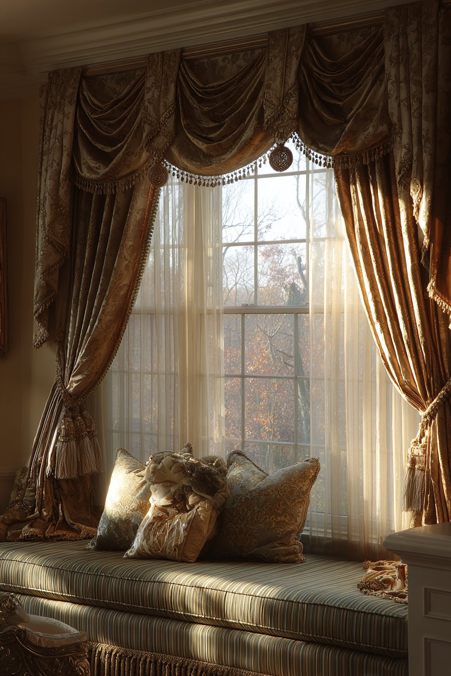 Floor-to-ceiling silk drapery panels in deep gold frame tall windows. Elaborate swag and jabot valance with tassel fringe crowns the treatment. Decorative rope tiebacks with ornate medallions hold the panels elegantly. Sheer undercurtains filter natural light while maintaining privacy. Traditional mullioned window panes add architectural character.