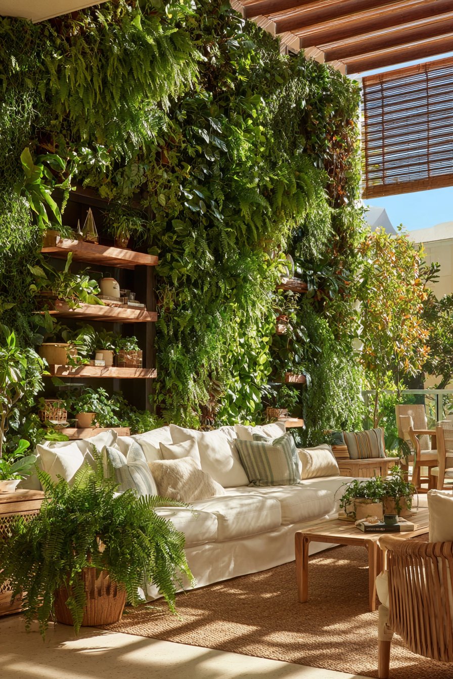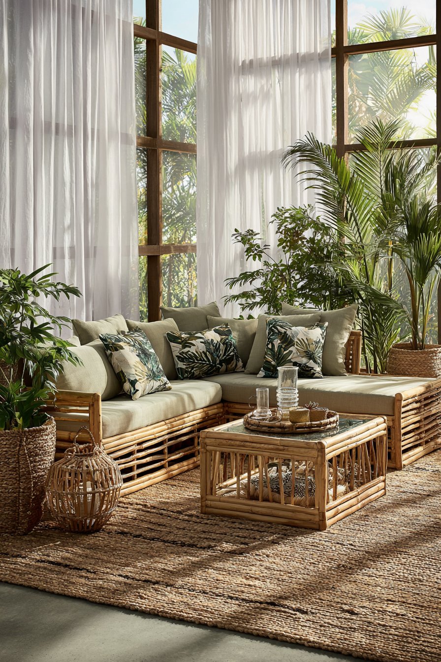The complete composition balances substantial furniture pieces with breathing room. Natural textures from rattan, jute, and linen create layered visual interest. This approach demonstrates how authentic materials elevate tropical design beyond mere decoration. The varied plant foliage adds dynamic movement and living energy to static furniture arrangements.