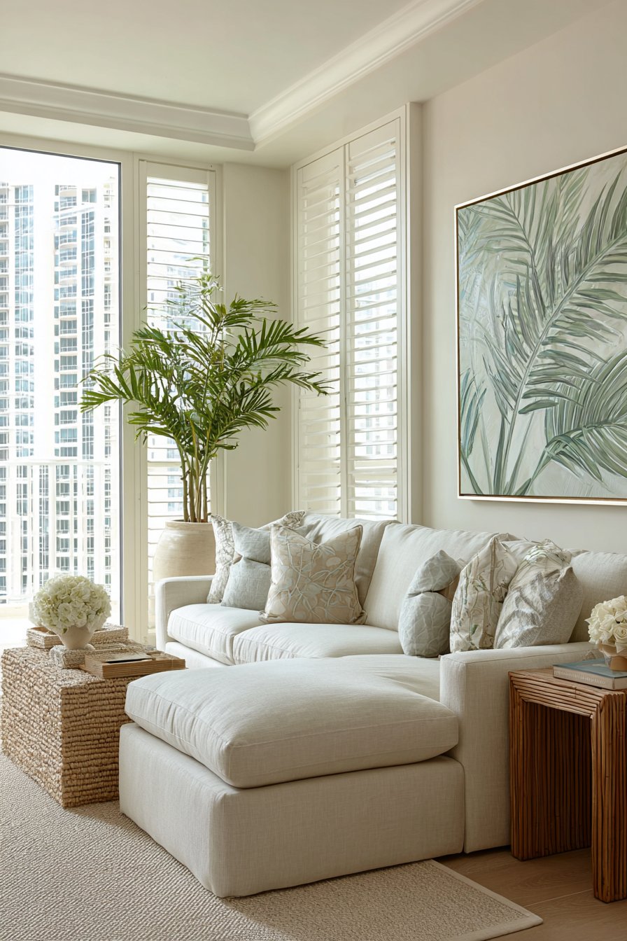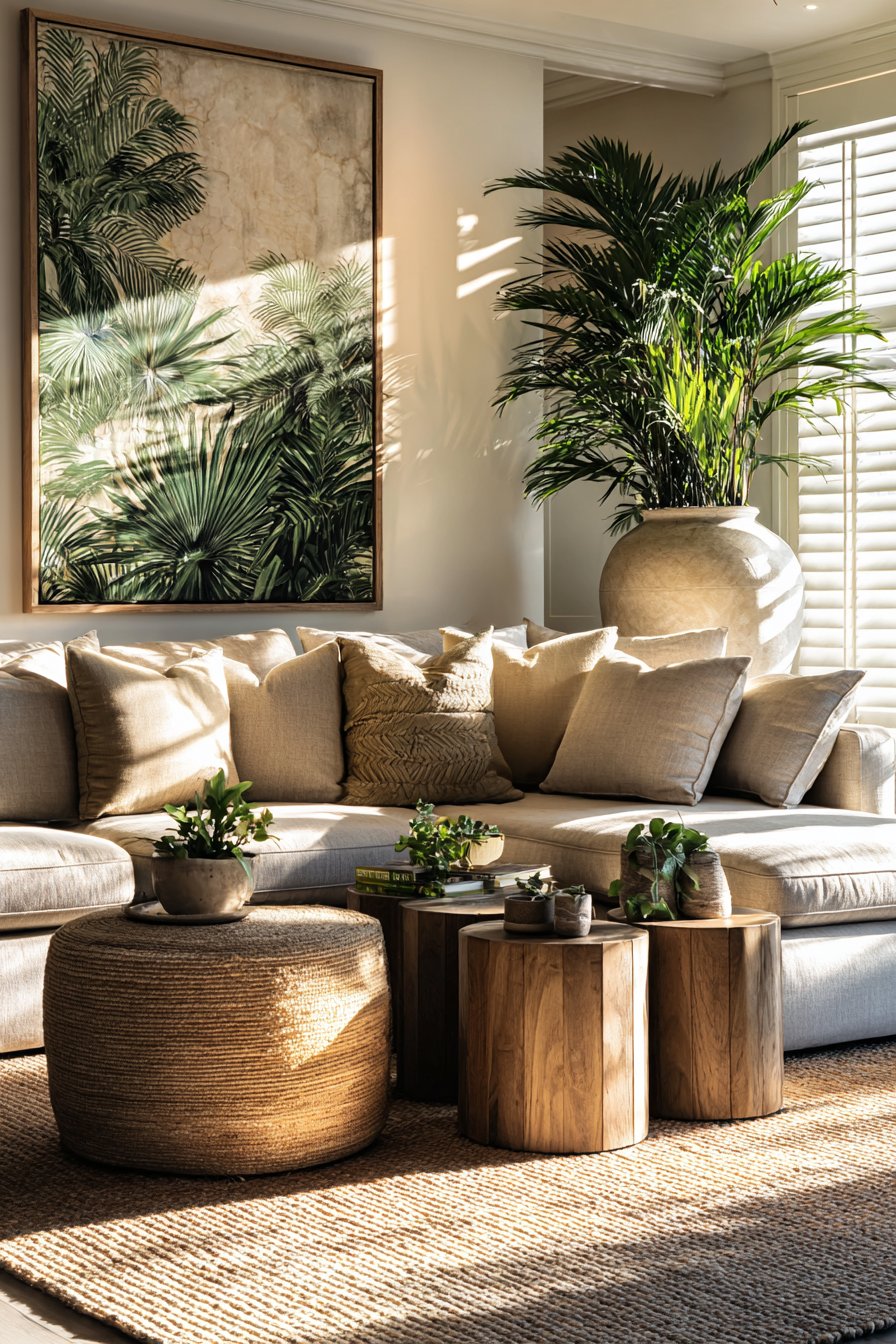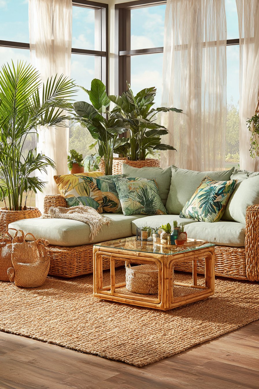 A deep rattan sectional anchors this tropical haven with organic texture and natural warmth. Oversized sage green linen cushions provide comfort while maintaining the nature-inspired palette. Tropical leaf-printed throw pillows add botanical interest without overwhelming the neutral foundation. The substantial seating arrangement creates an inviting gathering space for family and guests.