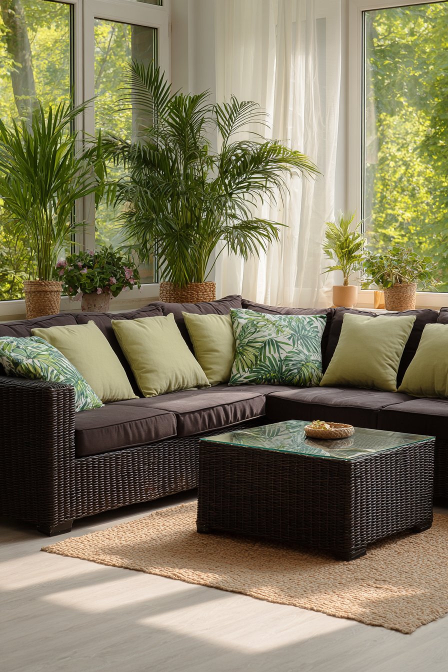 1. Rattan Sectional Paradise with Lush Greenery