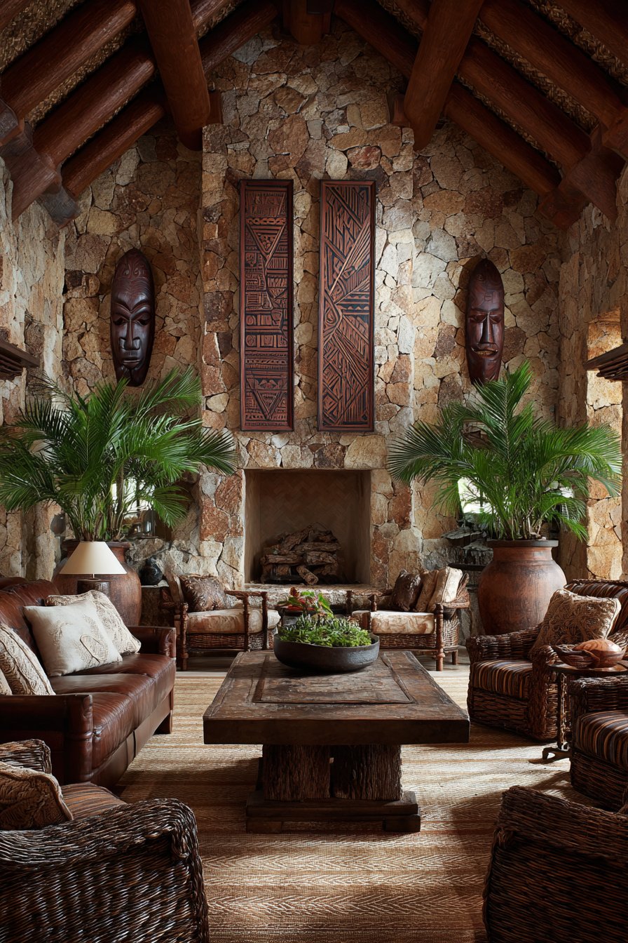 Natural stone fireplace surrounds add unexpected grounding elements to tropical living spaces. The material combination proves tropical design extends beyond warm climates exclusively. Soft morning light captures rich variation in natural wood finishes throughout. The illumination reveals aged leather patina and handcrafted textile details beautifully.