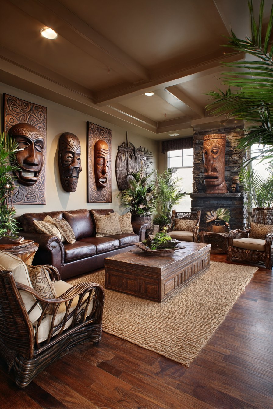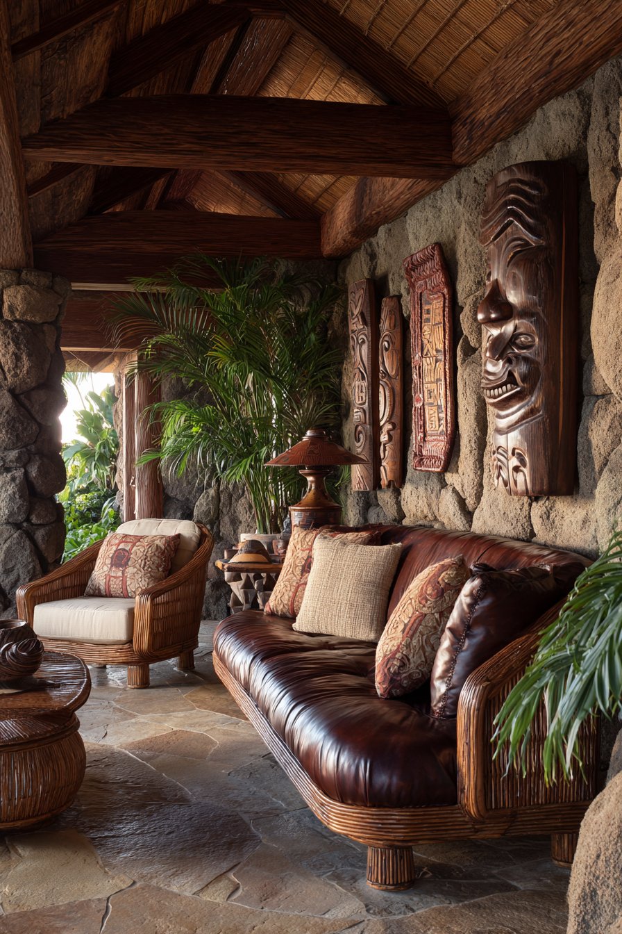 This design demonstrates respect for cultural authenticity in tropical interior design. Koa wood represents specific Hawaiian heritage rather than generic tropical woods. The leather and wicker combination creates comfortable, sophisticated seating arrangements. Traditional artwork adds meaningful cultural connections that elevate design beyond surface aesthetics.