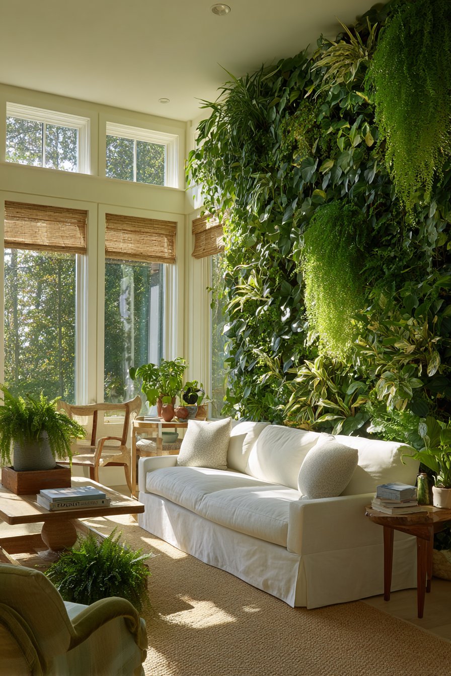 Fiddle leaf figs and rubber plant specimens create essential vertical interest throughout the space. These substantial plants fill corners and frame architectural features beautifully. Strategically placed skylights bathe natural materials in diffused daylight from above. The overhead illumination emphasizes textural depth in bamboo, stone, and weathered wood surfaces.