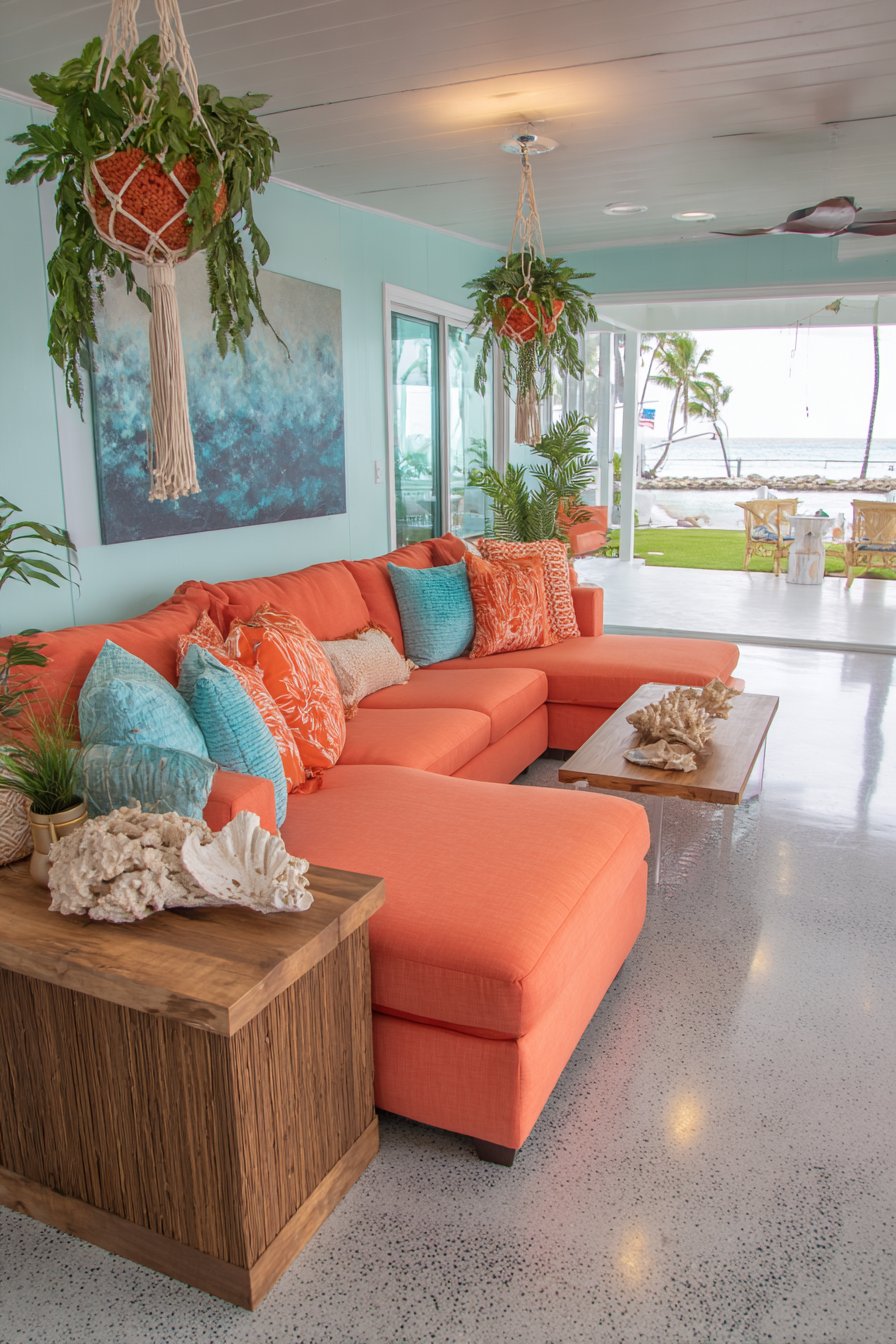 Sliding glass doors fully opened to covered lanais create seamless indoor-outdoor living transitions. The architectural strategy maximizes tropical climate advantages year-round. Interior modular sectionals in performance fabrics withstand exposure to outdoor elements. Tropical sunset colors including coral, amber, and deep turquoise cushions add vibrant energy.
