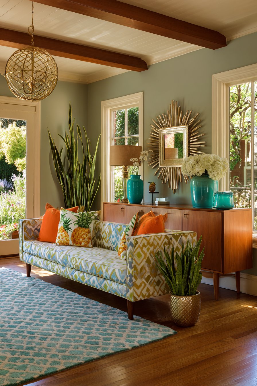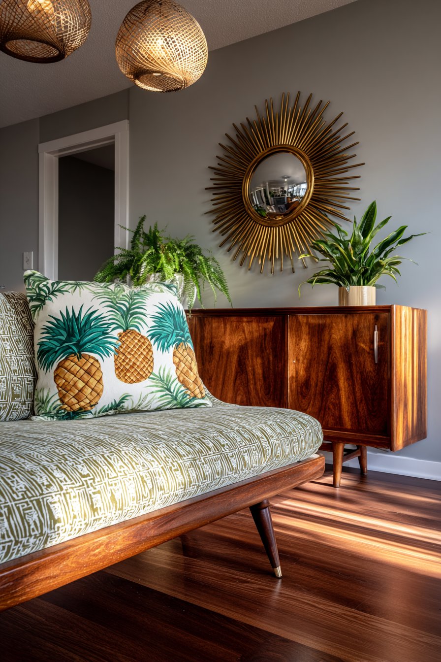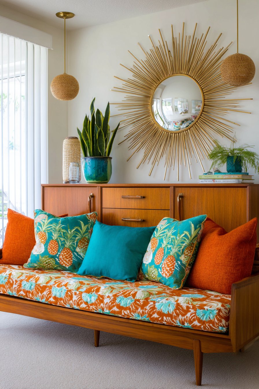 Vintage teak credenzas showcase mid-century modern furniture’s beautiful craftsmanship and timeless design. Geometric print fabrics in orange, turquoise, and avocado green evoke specific retro periods. Low-profile sofas with tapered wooden legs host retro tropical-themed pillows authentically. Stylized palm trees and pineapples add period-appropriate playful character.