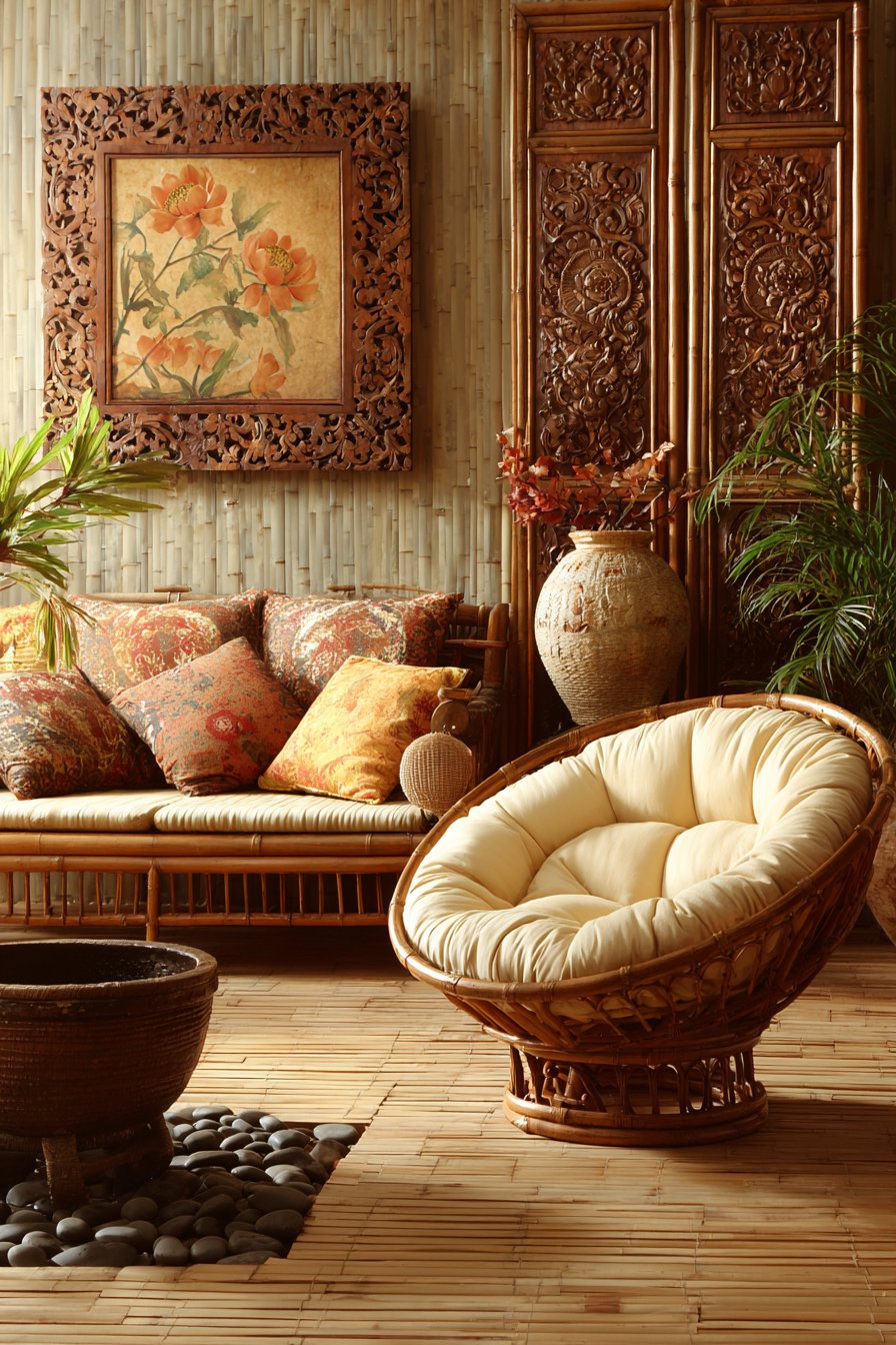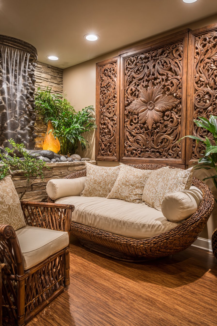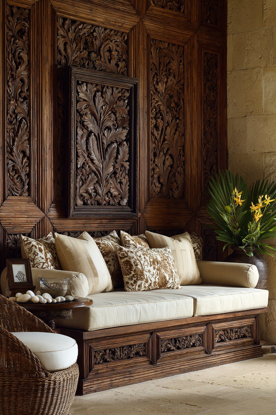 Balinese-inspired carved wooden panels serve as wall art with intricate floral and vine patterns. The hand-carved details represent hours of skilled artisan labor and cultural traditions. Low daybeds with batik cushions and bolster pillows create casual seating along walls. The floor-level seating encourages relaxed, informal gathering and conversation.