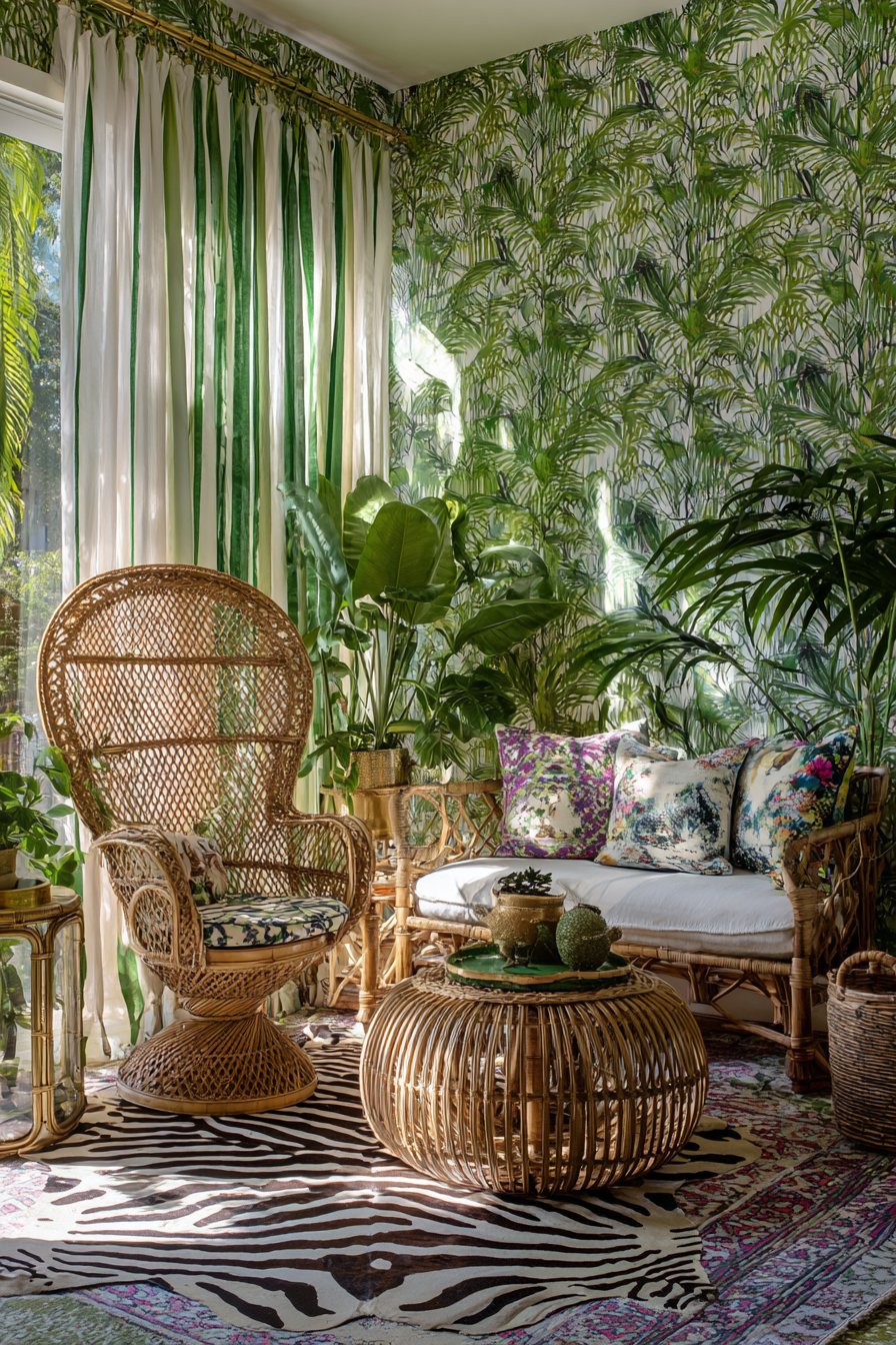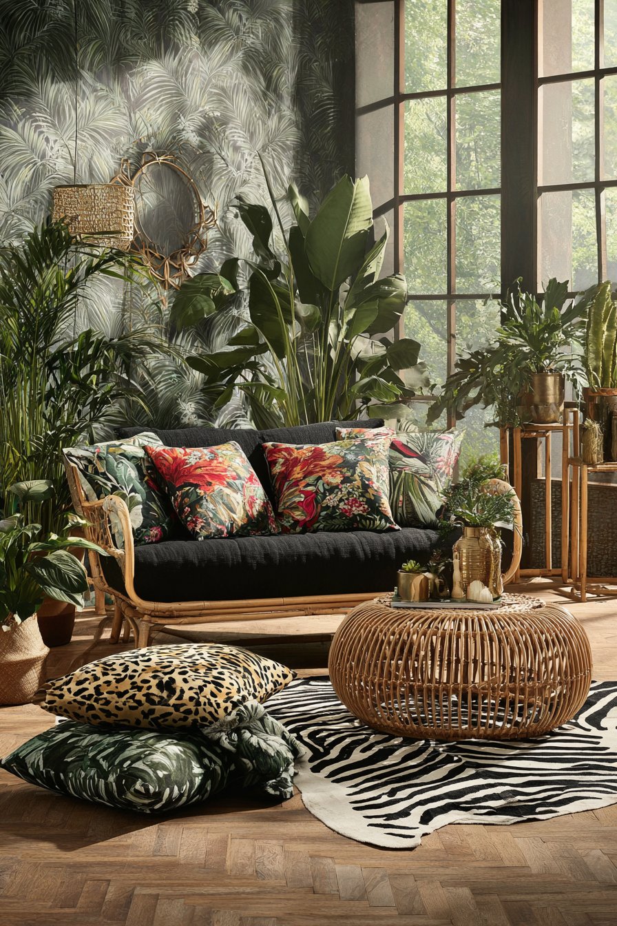 Palm print wallpaper creates bold botanical backdrop for fearless maximalist tropical design. Zebra-stripe cowhide rugs add an unexpected animal pattern to plant-dominated schemes. Mixed tropical fabric pillows in deliberately clashing prints create energetic visual complexity. The brave pattern mixing represents confident design that embraces abundance over restraint.