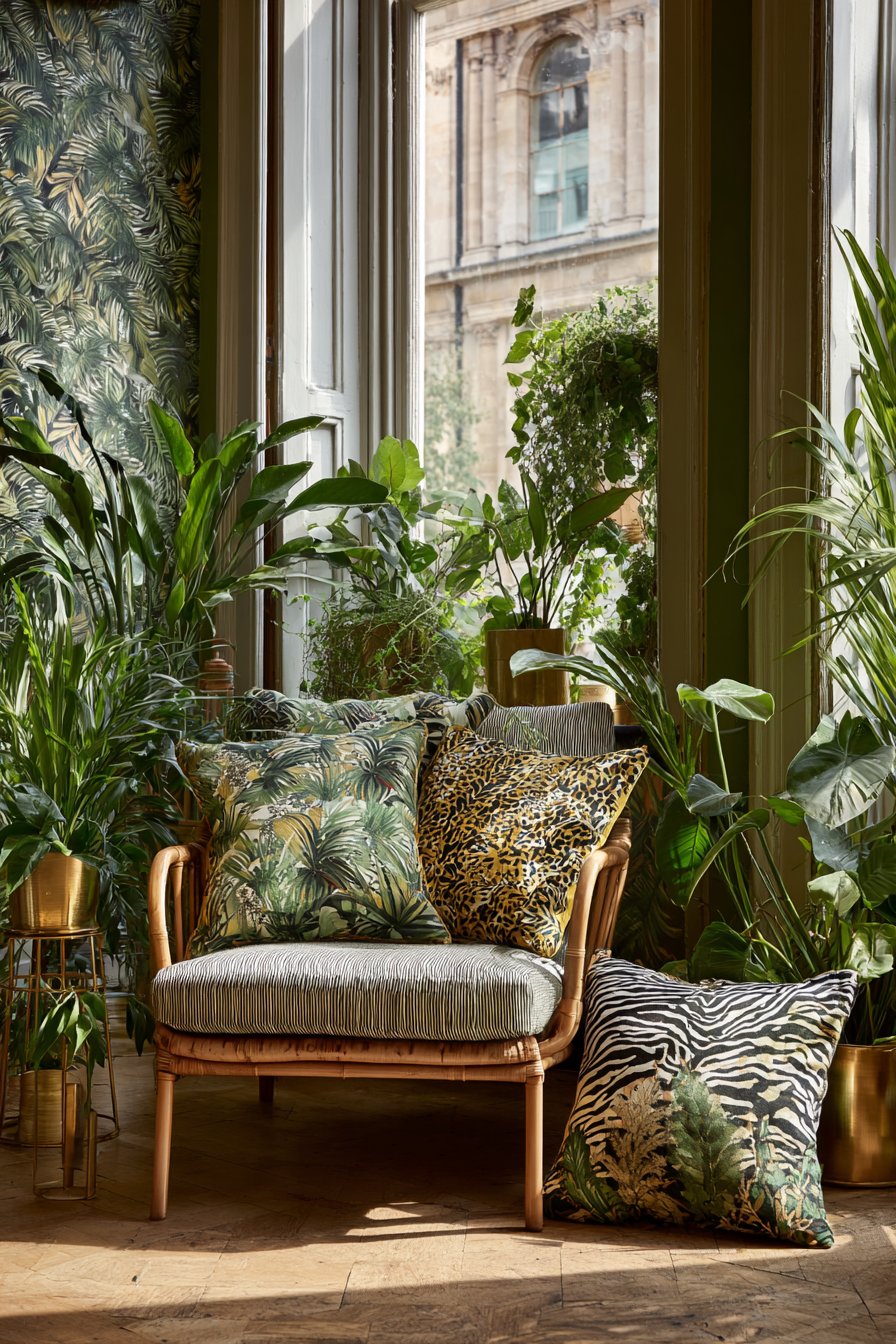 Natural wicker furniture with curved organic shapes provides neutral foundation amid pattern chaos. The simple furniture allows decorative elements to command attention appropriately. Collections of tropical plants, including banana leaf, monstera, and bird of paradise create an indoor jungle effect. The plant abundance transforms living spaces into lush botanical conservatories.