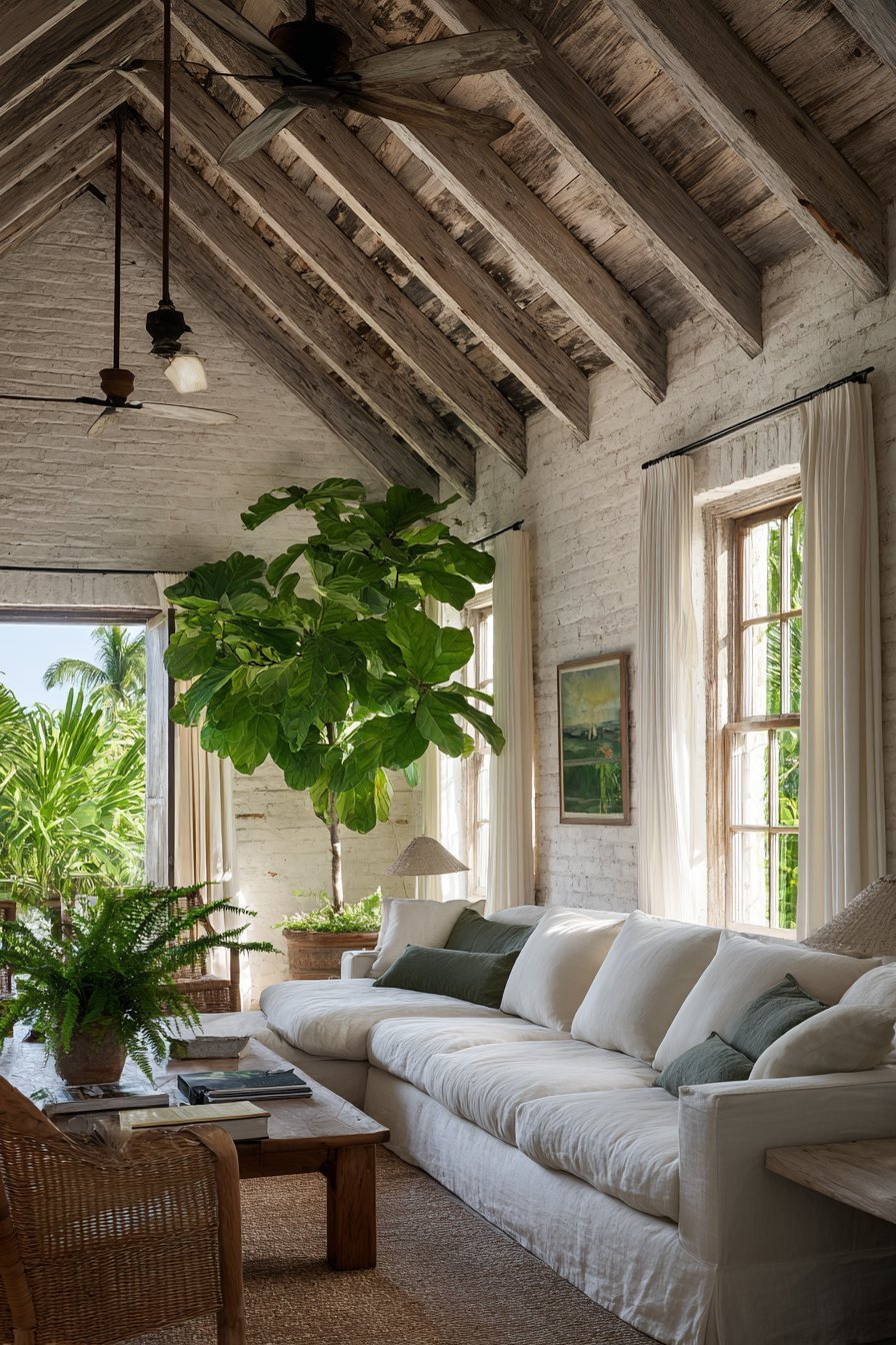 Natural linen sectionals in loose slipcover styles allow easy maintenance and seasonal cleaning. The casual fabric treatments suit tropical humidity and a relaxed lifestyle perfectly. Enormous fiddle leaf fig trees in corners reach toward skylights above. The vertical plants maximize height while connecting floor level to ceiling architecture.