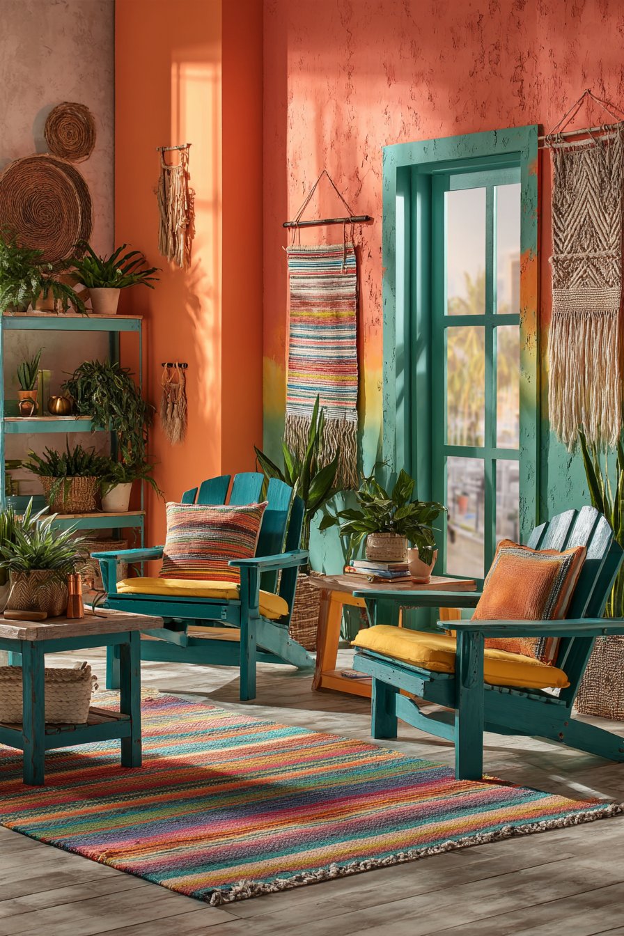 Large split-leaf philodendrons and prayer plants provide lush greenery against colorful backdrops. The living plants prevent saturated colors from overwhelming spaces with natural relief. Colorful striped dhurrie rugs cover light wood flooring with additional pattern layers. Bright natural daylight captures bold saturated colors with accurate, realistic representation.