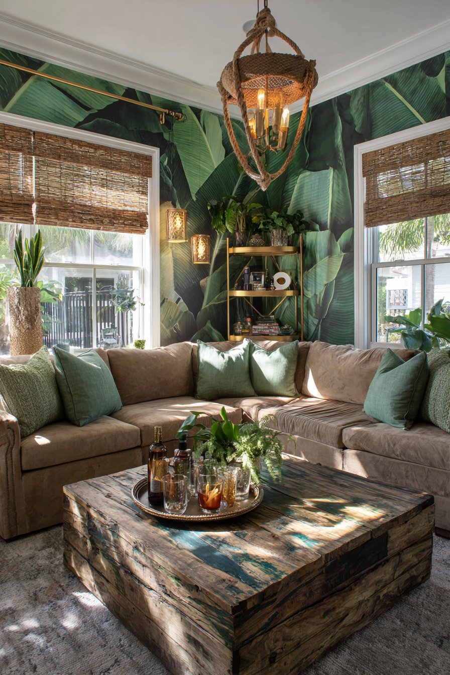 Banana leaf wallpaper creates dramatic accent walls that command attention without overwhelming. The bold botanical pattern provides backdrop for entertaining-focused furniture arrangements. Natural window lighting combines with ambient rope-wrapped pendant lights for layered illumination. The mixed lighting strategies accommodate daytime gatherings and evening entertainment equally.