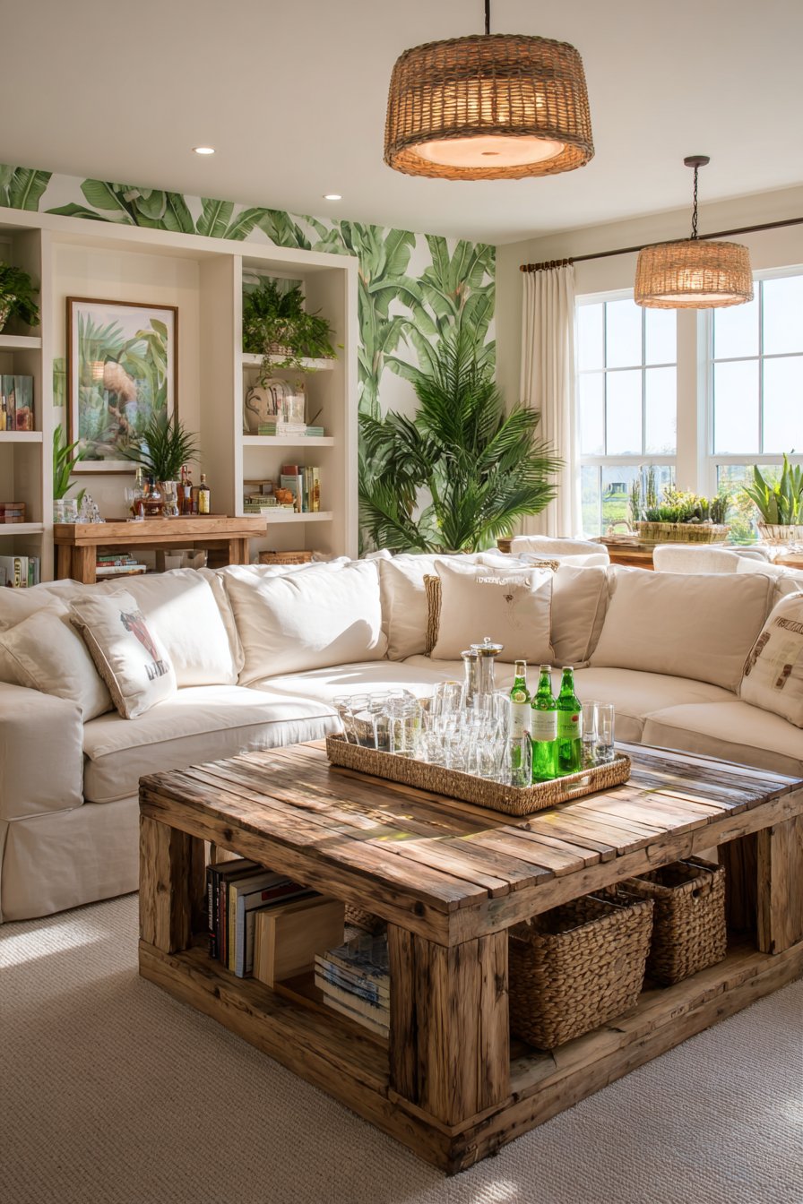 An oversized sectional in natural linen hosts abundant tropical printed pillows. Hibiscus and palm patterns add colorful botanical interest against neutral foundations. The substantial seating accommodates large gatherings comfortably. Reclaimed teak coffee tables with live edge details center the conversation area perfectly.